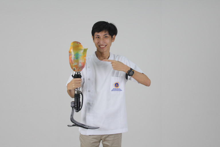 “การตัดสินใจเลือกเรียนในสายนี้ ไม่เคยได้รับการต่อต้านจากครอบครัวครับ แต่ก็ยอมรับตามตรงว่าในตอนแรก พ่อแม่และตัวผมเอง รวมถึงหลายๆ คนที่ผมรู้จัก ไม่มีใครรู้จักอาชีพนักกายอุปกรณ์มาก่อน ไม่รู้ว่ามีหน้าที่ทำอะไร หน้าที่การงานจะมั่นคงไหม พ่อกับแม่มักจะถามผมหลาย ๆ ครั้งว่าตัดสินใจดีแล้วใช่ไหม ผมชอบจริง ๆ หรือเปล่า ซึ่งผมก็เลือกที่จะแสดงให้ทุกคนเห็นว่าทำไมผมถึงตัดสินใจมาเรียนสาขาวิชาชีพนี้ เพราะผมได้ศึกษาอย่างละเอียดแล้ว ทั้งการเรียน หน้าที่การงาน รวมไปถึงโอกาสในการทำงานในอนาคต และที่สำคัญอาชีพนักกายอุปกรณ์ ซึ่งเป็นผู้ผลิตอุปกรณ์เพื่อใช้ฟื้นฟูสุขภาพผู้พิการจากการมีอวัยวะผิดปกติหรือสูญเสียอวัยวะ เพื่อให้สามารถดำรงชีวิตร่วมกับคนปกติในสังคมได้ ถือเป็นอาชีพที่มีความมั่นคงทั้งเส้นทางการเติบโตในอาชีพและรายได้ตอบแทน แล้วผมยังรู้มาอีกว่าอาชีพนักกายอุปกรณ์เป็นอาชีพที่เป็นที่ต้องการอย่างมากในปัจจุบัน เพราะด้วยจำนวนของผู้พิการที่สูงขึ้น แต่มีนักกายอุปกรณ์ในประเทศอยู่จำนวนน้อย มันยิ่งทำให้ผมอยากประกอบอาชีพนี้ บวกกับผมรู้สึกว่ามันคือตัวตนของผม มันคือสิ่งที่ผมชอบและอยากทำ ผมเป็นคนที่ถ้าทำอะไรแล้วมีความสุข ผมจะทุ่มเทกับมันมาก ๆ เพื่อให้ทุก ๆ อย่างออกมามีประสิทธิภาพมากที่สุด”