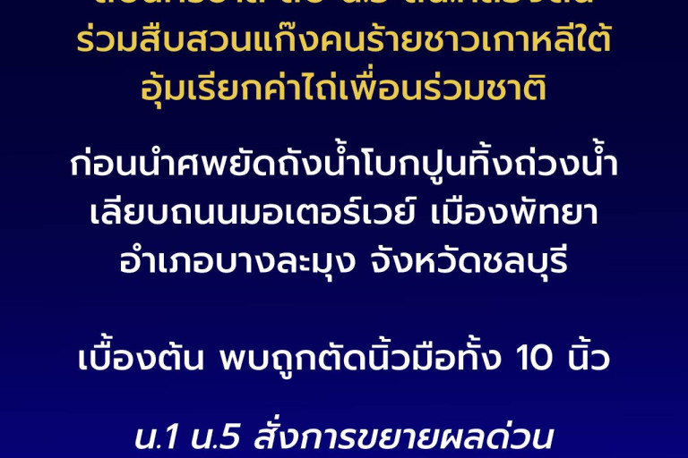 ล่าสุด เมื่อวันที่ 12 พ.ค.67 เพจเฟซบุ๊ก "สืบนครบาล IDMB" โพสต์ข้อความ ระบุว่า สืบ น.5 สน.คลองตัน ร่วมสืบสวนแก๊งคนร้ายชาวเกาหลีใต้อุ้มเรียกค่าไถ่เพื่อนร่วมชาติ ก่อนนำศพยัดถังน้ำโบกปูนทิ้งถ่วงน้ำ เลียบถนนมอเตอร์เวย์ เมืองพัทยา อำเภอบางละมุง จังหวัดชลบุรี เบื้องต้น พบถูกตัดนิ้วมือทั้ง 10 นิ้ว น.1 น.5 สั่งการขยายผลด่วน