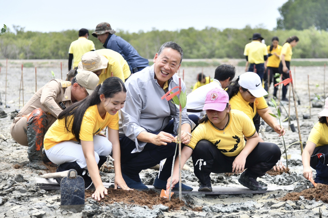 จากนั้นนายกฯ พร้อมคณะนั่งรถรางชมภายในโครงการและฟังบรรยายสรุปเกี่ยวกับเทคโนโลยีเทคโนโลยีธรรมชาติการบำบัดน้ำเสียและการกำจัดขยะชุมชน  ก่อนที่จะไปทักทายประชาชน และร่วมกับรัฐมนตรี ผู้ว่าฯ ประชาชนประมาณ 100 คน ปลูกป่าชายเลน ที่บริเวณแปลงวิจัยระบบป่าชายเลนบำบัดน้ำเสีย ซึ่งต้นโกงกางใบใหญ่ โดยนายกรัฐมนตรีกล่าวว่า ที่ตนปลูกเป็นต้นโกงกางใบใหญ่ เมื่อปลูกไปแล้วอัตราการตายไม่มี แสดงว่าการปลูกวันนี้รอดทุกต้น และที่ตนปลูกทั้งกระถางซึ่งสานจากต้นไผ่นั้นสามารถย่อยสลายตามธรรมชาติ