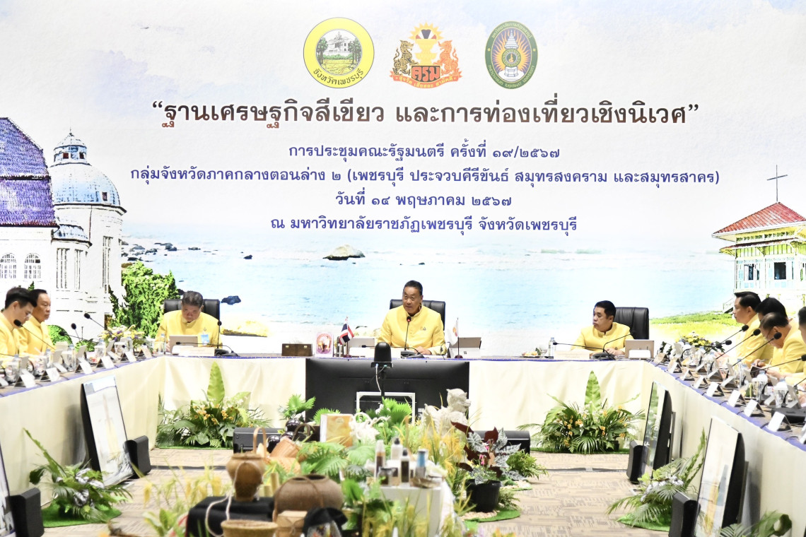 เมื่อเวลา 10.00 น. วันที่ 14 พ.ค. 2567 ที่ห้องประชุมพะนอมแก้วกำเนิด ชั้น 2 อาคารสุเมธตันติเวชกุล มหาวิทยาลัยราชภัฏเพชรบุรี ตำบลนาวุ้ง อำเภอเมืองเพชรบุรี จังหวัดเพชรบุรี นายเศรษฐา ทวีสิน นายกรัฐมนตรี นายกรัฐมนตรี เป็นประธานการประชุมคณะรัฐมนตรีอย่างเป็นทางการนอกสถานที่ ครั้งที่ 3/2567 “ฐานเศรษฐกิจสีเขียว และการท่องเที่ยวเชิงนิเวศ” โดยนายกฯ และ ครม.สวมใส่เสื้อสีเหลือง ผ้าลายสุวรรณวัชร์ ผ้าอัตลักษณ์ประจำจังหวัดเพชรบุรี ซึ่งนำมาตัดเย็บเป็นเสื้อมอบเป็นของที่ระลึกให้ ครม.