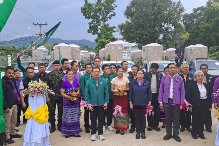 วันนี้ (15 พฤษภาคม 2567) นายเกียรติศักดิ์ พระวร ผู้ช่วยผู้จัดการธนาคารเพื่อการเกษตรและสหกรณ์การเกษตร (ธ.ก.ส.) นายอุทัย พิมพ์ไกร รองผู้อำนวยการฝ่ายกิจการสาขาภาคเหนือตอนบน นายรังสรรค์ บูรณะธนัง ผู้อำนวยการ สำนักงาน ธ.ก.ส. จังหวัดเชียงใหม่ นางสุพร ตรีนรินทร์ เลขาธิการ สำนักงานคณะกรรมการพิเศษเพื่อประสานงานโครงการอันเนื่องมาจากพระราชดำริ (สำนักงาน กปร.) และ นายธนากร ดอนเหนือ อธิบดีกรมส่งเสริมการเรียนรู้ (สกร.) ร่วมมอบถังกักเก็บน้ำ ขนาดปริมาตร 1,000 ลิตร พร้อมอุปกรณ์ ให้แก่ศูนย์การเรียนชุมชนชาวไทยภูเขา "แม่ฟ้าหลวง" อำเภออมก๋อยจังหวัดเชียงใหม่ เพื่อช่วยเหลือและบรรเทาปัญหาการขาดแคลนน้ำจากภัยแล้งให้กับประชาชนในพื้นที่ที่ประสบภัยแล้งได้มีน้ำไว้อุปโภคบริโภคและประกอบอาชีพในช่วงฤดูแล้ง ภายใต้โครงการพัฒนาเด็กและเยาวชนในถิ่นทุรกันดารตามแนวพระราชดำริ สมเด็จพระกนิษฐาธิราชเจ้า กรมสมเด็จพระเทพรัตนราชสุดาฯ สยามบรมราชกุมารี โดยจะมีการส่งมอบถังน้ำและระบบรางรินน้ำไปยังศูนย์การเรียนชุมชนชาวไทยภูเขา "แม่ฟ้าหลวง" พร้อมทั้งมอบต้นกาแฟอาราบิก้า จากคณะเกษตรศาสตร์ มหาวิทยาลัยเชียงใหม่ จำนวน 3,600 ต้น ตามแนวทางการปลูกป่าสร้างรายได้ให้แก่ชุมชน และส่งเสริมการจัดทำฝายแกนดินชีเมนต์แก่ศูนย์การเรียนรู้ชุมชนทั้ง 18 แห่ง ซึ่งได้รับการสนับสนุนวิทยากรจากศูนย์ศึกษาการพัฒนาห้วยฮ่องไคร้อันเนื่องมาจากพระราชดำริ จังหวัดเชียงใหม่