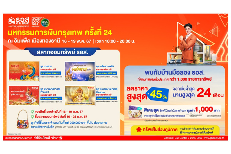 นายกมลภพ วีระพละ กรรมการผู้จัดการ ธนาคารอาคารสงเคราะห์ (ธอส.) เปิดเผยว่า ธอส. ในฐานะสถาบัน การเงินของรัฐ ที่มีพันธกิจ “ทำให้คนไทยมีบ้าน” พร้อมสนับสนุนให้คนไทยมีที่อยู่อาศัยเป็นของตนเองได้ง่ายขึ้น จึงได้จัดโปรโมชันพิเศษในงาน “มหกรรมการเงินกรุงเทพฯ ครั้งที่ 24 Money Expo 2024 Bangkok” เพิ่มโอกาสให้ประชาชนในกรุงเทพฯ และปริมณฑล ได้เข้าถึงผลิตภัณฑ์ทางการเงินของธนาคารได้มากขึ้น โดยนำเสนอผลิตภัณฑ์ภายในงาน ประกอบด้วย (1) สินเชื่อบ้านอัตราดอกเบี้ยพิเศษ อัตราดอกเบี้ยเดือนที่ 1 - 6 เท่ากับ 1.99% ต่อปี, เดือนที่ 7 - 36 เท่ากับ 3.19% ต่อปี (อัตราดอกเบี้ยเฉลี่ย 3 ปีแรกเท่ากับ 2.99% เท่านั้น) และปีที่ 4 จนถึงตลอดอายุสัญญา กรณีลูกค้าสวัสดิการเท่ากับ MRR-1.00% ต่อปี, ลูกค้ารายย่อย เท่ากับ MRR-0.50% ต่อปี และการกู้ชำระหนี้เกี่ยวกับที่อยู่อาศัย เท่ากับ MRR (อัตราดอกเบี้ย MRR ธอส. ในปัจจุบัน เท่ากับ 6.545% ต่อปี) ผ่อนชำระนานสูงสุดถึง 40 ปี ให้กู้ครอบคลุมทุกวัตถุประสงค์หลัก อาทิ ซื้อบ้าน/คอนโดมิเนียม ปลูกสร้าง ต่อเติม ซ่อมแซม รีไฟแนนซ์ และชำระหนี้เกี่ยวกับที่อยู่อาศัย โดยสามารถจองสิทธิ์ภายในงานผ่าน Line GHB Buddy ยื่นคำขอกู้ได้ตั้งแต่วันที่ 16 พฤษภาคม – 28 มิถุนายน 2567 และทำนิติกรรมภายในวันที่ 31 กรกฎาคม 2567 โดยผู้กู้ จะได้สิทธิ์ค่าประเมินราคาหลักประกันอัตราพิเศษอีกด้วย แ ละพิเศษสุดสำหรับลูกค้าภายในงานเท่านั้นช่วง Golden Minute อัตราดอกเบี้ยต่ำสุด ๆ เปิดจองสิทธิ์ผ่าน Mobile Application : GHB ALL GEN ในวันอาทิตย์ที่ 19 พฤษภาคม 2567 ระหว่างเวลา 15.00-15.15 น. จองก่อนได้ก่อน กรอบวงเงินจำกัดและเงื่อนไขตามที่ธนาคารกำหนด พิเศษ! สำหรับลูกค้าที่มีวงเงินทำนิติกรรมสูงสุด 10 อันดับแรก รับของสมนาคุณฟรีมากมาย!! โดยลำดับที่ 1-5 รับเครื่องดูดฝุ่น Robot 1 เครื่อง และบัตรกำนัลห้องพักพร้อมอาหารเช้าจำนวน 3 วัน 2 คืน จากโรงแรมดุสิตดีทู สามย่าน (ลำดับละ 1 สิทธิ์), ลำดับที่ 6-10 รับเครื่องชงกาแฟแบบหยด ยี่ห้อ BUONO 1 เครื่อง และ Gift Voucher HomePro มูลค่ารวม 1,000 บาท (ลำดับละ 1 สิทธิ์)
