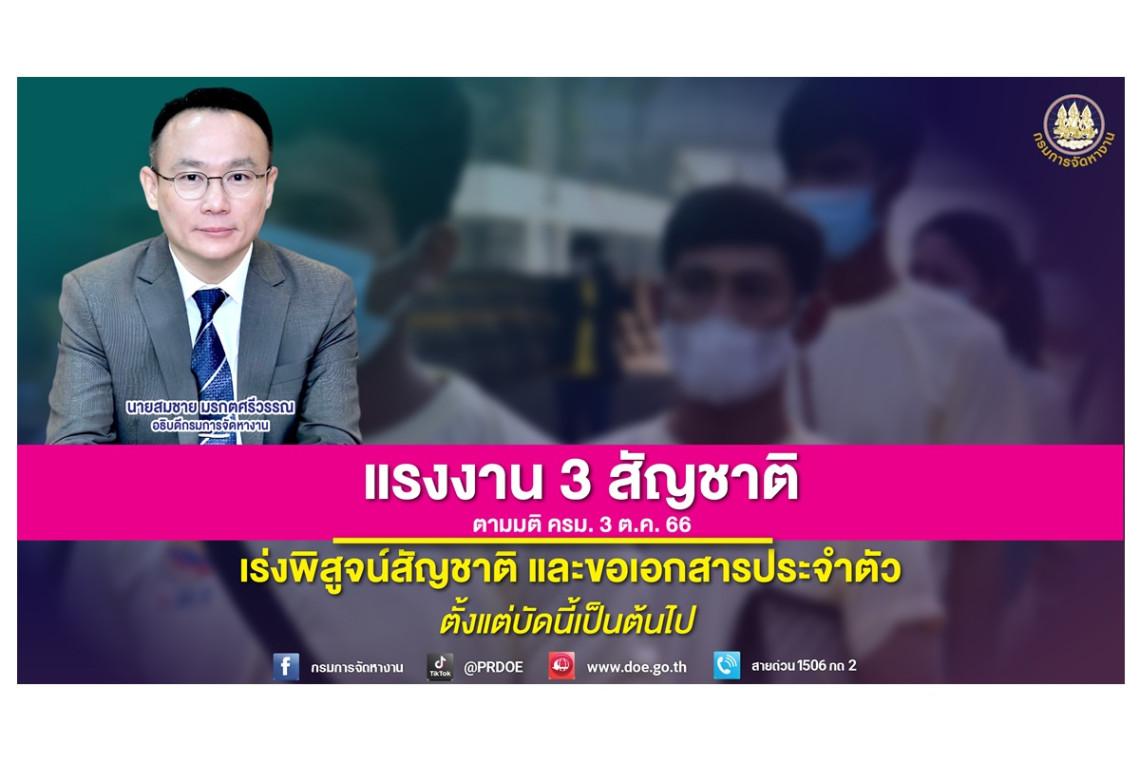 กรมการจัดหางานแจงแนวทางพิสูจน์สัญชาติ และขอรับเอกสารประจำตัว แรงงาน 3 สัญชาติ กัมพูชา ลาว เมียนมา ย้ำดำเนินการได้ตั้งแต่บัดนี้เป็นต้นไป