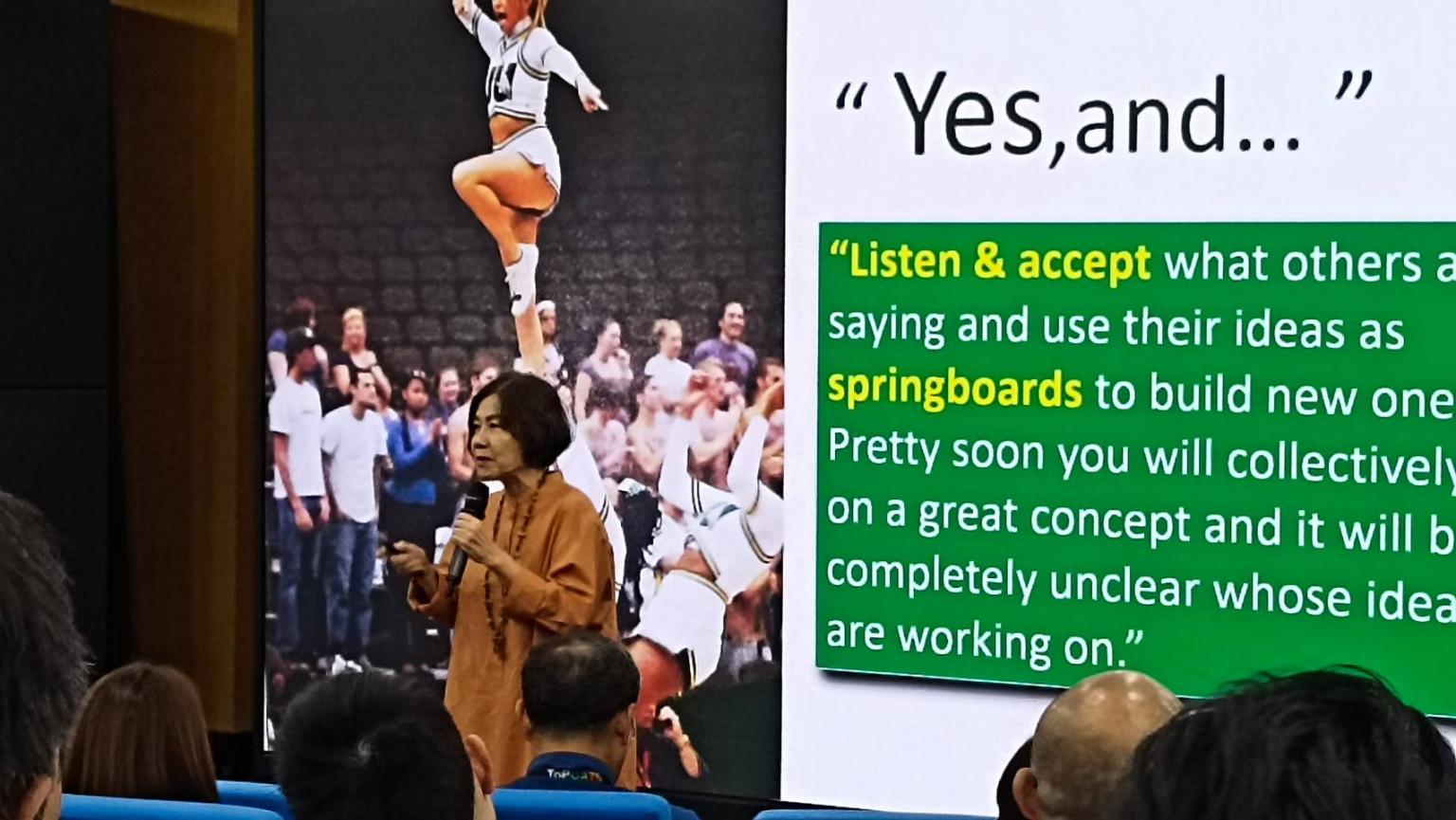 จากนั้นให้ตัวแทนแต่ละกลุ่มส่งตัวแทนเพื่อการออกไอเดียระดมสมอง  ด้วยการคำว่า Yes,and คือ เห็นด้วยและแสดงความเห็นเพิ่ม โดยไม่ใช้คำว่าแต่ ไม่ว่าจะเห็นด้วยหรือไม่ก็ให้ใช้คำว่า Yes เห็นด้วยเท่านั้น ตามโจทย์ที่ได้รับ ซึ่งปรากฎว่า ทำให้ได้ไอเดียและบรรยากาศที่ดี เพราะเป็นการรับฟัง ยอมรับไอเดีย และช่วยต่อยอดทำให้ได้ไอเดียจริง ที่เป็นแผนและสามารถนำไปใช้ได้จริงในที่ทำงาน