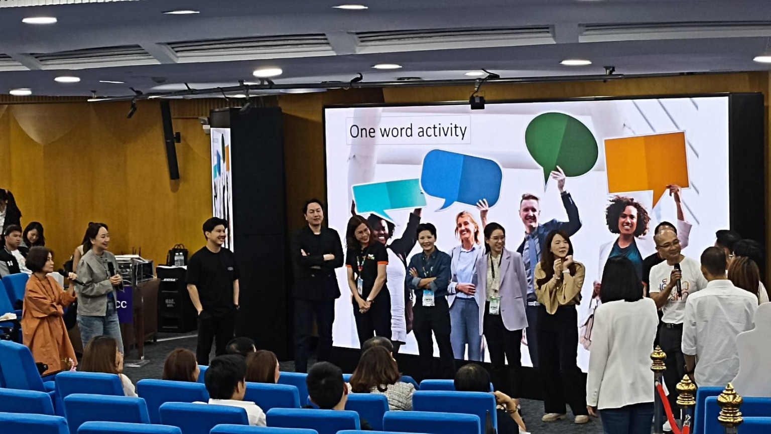 การออกไอเดียร่วมกันไม่ใช่เรื่องง่าย ซึ่งได้ทำลองโดยให้ผู้เรียนกลุ่มละ 2 คน รวม 12 คน ที่ยังไม่รู้จักกันดี เพราะต่างที่มา ให้พูดถึง “one word Activities” ต่อกันคนละหนึ่งคำซึ่งแต่ละคนสามารถคิดสร้างสรรค์คำและ ต่อเป็นประโยค ได้