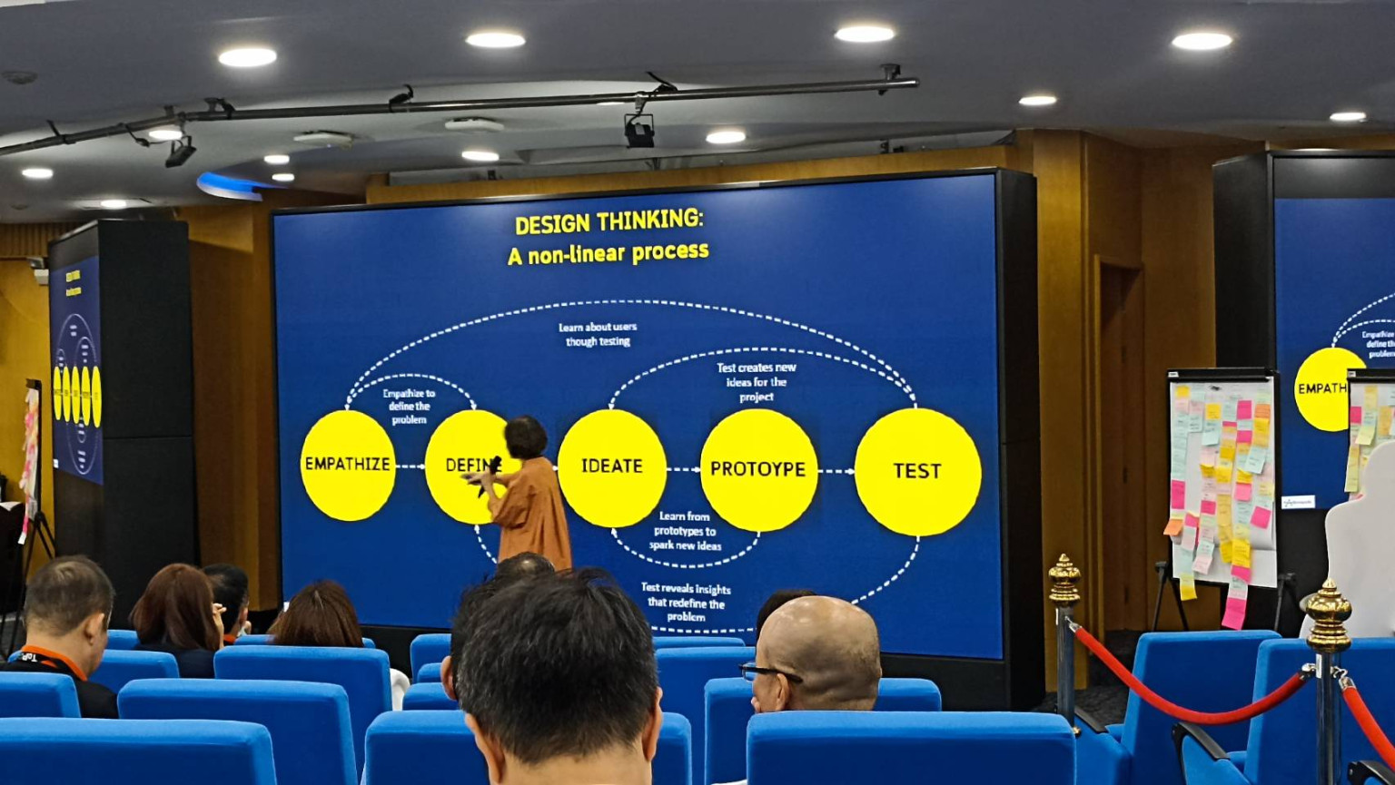 Design Thinking มีกระบวนการที่สามารถกลับไปทำใหม่ได้ เช่น ขั้นตอนไหนไม่ได้ผลก็สามารถกลับมาเริ่มต้นทำใหม่ ซึ่งต้อง Empathize  และ Define ให้ถูกต้องก่อน  ทั้งหมดนี้เป็นกระบวนการ Design Thinking จากการเรียนรู้และทดลองทำ โดยไม่กลัวความล้มเหลว เป็นการคิด วางแผน และปฏิบัติด้วยการทำงานเป็นทีม ซึ่งความคิดสร้างสรรค์ สามารถเรียนรู้และฝึกได้เพื่อความสำเร็จ โดยเน้นตัวคนเป็นศูนย์กลาง