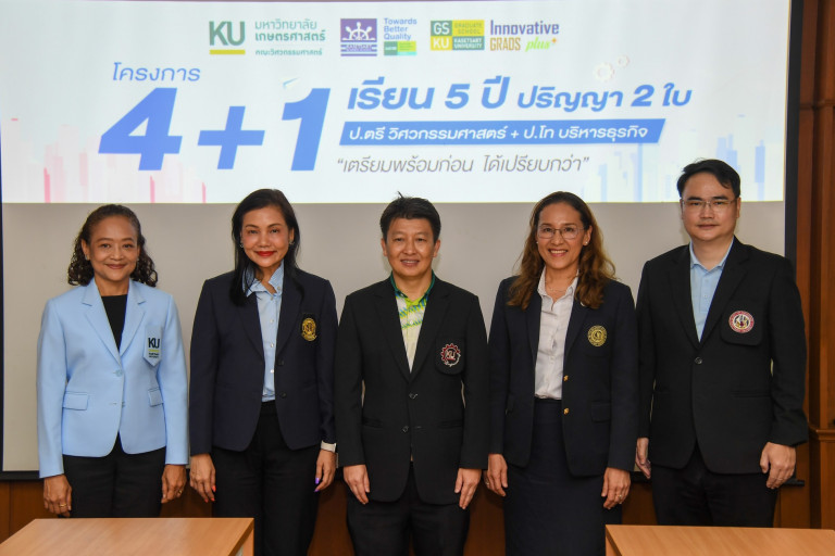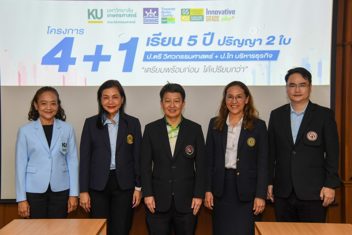 เมื่อวันที่ 16 พฤษภาคม 2567 คณะวิศวกรรศาสตร์ร่วมกับคณะบริหารธุรกิจ และบัณฑิตวิทยาลัย มหาวิทยาลัยเกษตรศาสตร์ จัดงานแถลงข่าวโครงการเรียนล่วงหน้าระดับบัณฑิตศึกษาหลักสูตรบริหารธุรกิจมหาบัณฑิต (ภาคปกติ) หรือ โครงการ 4+1 เรียน 5 ปี ได้ 2 ปริญญา คือ ปริญญาวิศวกรรมศาสตรบัณฑิต และ ปริญญาบริหารธุรกิจมหาบัณฑิต บูรณาการองค์ความรู้ของทั้ง 2 ศาสตร์ สู่การเป็น “วิศวกรนักบริหาร” โดยเปิดโอกาสให้กับนิสิตในระดับปริญญาตรีชั้นปีที่ 4 ของคณะวิศวกรรมศาสตร์ ได้ศึกษาต่อในระดับปริญญาโทในคณะบริหารธุรกิจ โดยใช้ระยะเวลาศึกษาเพียง 4+1 ปี คือเรียนระดับปริญญาตรี 4 ปี และระดับปริญญาโท 1 ปี จากเดิมต้องเรียน 2 ปี นิสิตที่เข้าร่วมโครงการ สามารถพัฒนาโครงงานวิศวกรรม (Senior Project) ร่วมกับคณะบริหารธุรกิจ และต่อยอดโครงงานบูรณาการนี้เป็นวิทยานิพนธ์ระดับบัณฑิตศึกษา และยังสามารถเทียบโอนรายวิชาที่เรียนล่วงหน้ามายังหลักสูตรได้ตามเงื่อนไขที่กำหนด ทั้งนี้นิสิตจะได้รับการสนับสนุนยกเว้นค่าบำรุงการศึกษา ค่าธรรมเนียมพิเศษคณะ ค่าธรรมเนียมการสมัครแรกเข้า และค่าบัตรประจำตัว ซึ่งนับเป็นโมเดลแรกของมหาวิทยาลัยเกษตรศาสตร์ ที่เกิดขึ้นจากความร่วมมือกันระหว่าง 2 คณะ โดยมีคณบดีคณะวิศวกรรมศาสตร์ ศ.ดร.วันชัย ยอดสุดใจ คณบดีคณะบริหารธุรกิจ รศ.ดร.ศศิวิมล มีอำพล คณบดีบัณฑิตวิทยาลัย รศ.ดร.ศรีจิตรา เจริญลาภนพรัตน์ และรองคณบดีฝ่ายวิชาการและพัฒนาคุณภาพการศึกษา คณะบริหารธุรกิจ ผศ.ดร.หฤทัย นำประเสริฐชัย ร่วมกันแถลงข่าว ณ ห้องประชุม 0203 ชั้น 2 อาคารชูชาติ กำภู คณะวิศวกรรมศาสตร์ มหาวิทยาลัยเกษตรศาสตร์