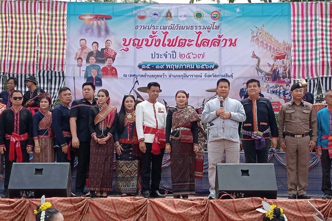 ผู้สื่อข่าวรายงาน ว่า ชาวผู้ไทหลายอำเภอในจังหวัดกาฬสินธุ์ ร่วมจัดริ้วขบวนแห่บั้งไฟตะไล 10 ล้าน พร้อมด้วยขบวนรถบุปผาชาติและขบวนวิถีชาวผู้ไท ยาวเหยียดกว่า 11 ขบวน ระยะทางเกือบ 3 กิโลเมตร โดยนำผ้าไหมแพรวาหลากสีสัน มูลค่าหลายสิบล้านบาท มาตกแต่งบั้งไฟตะไลรูปทรงวงกลม พร้อมร่ายรำบูชาพญาแถน ในงานประเพณีวัฒนธรรมผู้ไทบุญบั้งไฟตะไลล้าน จังหวัดกาฬสินธุ์ ประจำปี 2567