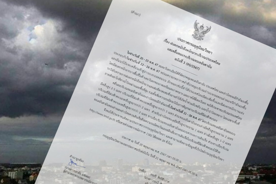วันที่ 20 พ.คง67 กรมอุตุนิยมวิทยา ประกาศเรื่อง ฝนตกหนักถึงหนักมากบริเวณประเทศไทยและคลื่นลมแรงบริเวณทะเลอันดามันฉบับที่ 3 (95/2567)