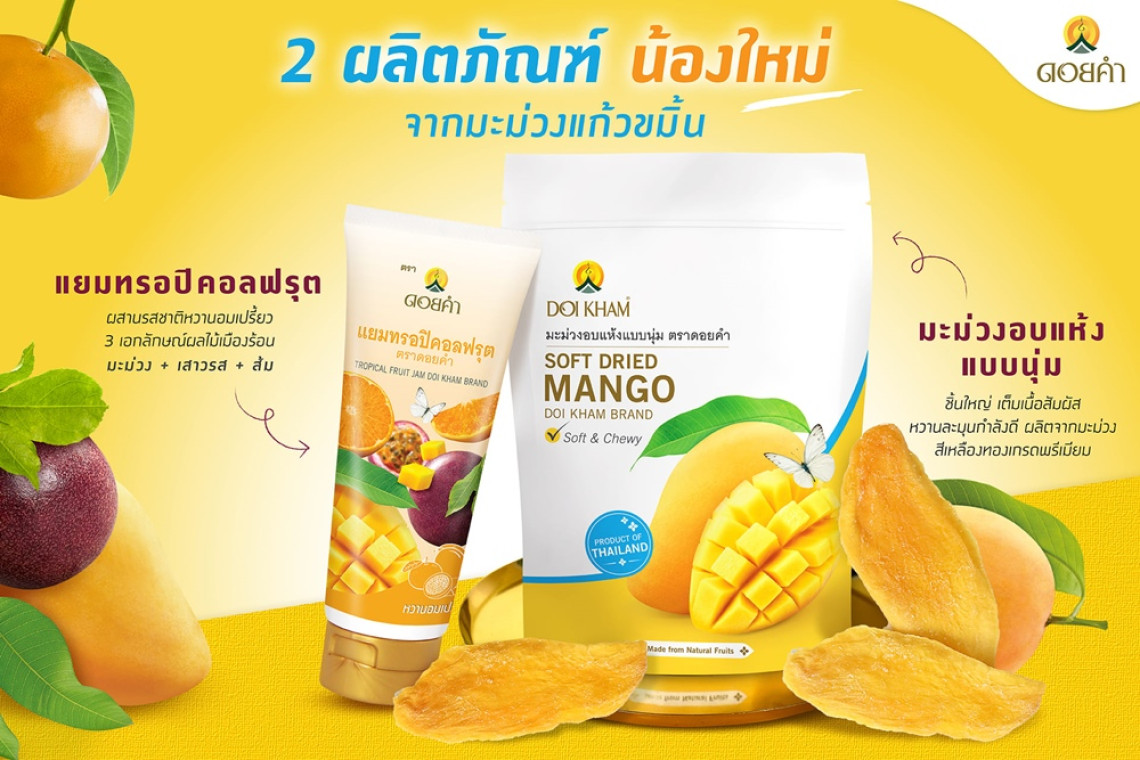 บริษัท ดอยคำผลิตภัณฑ์อาหาร จำกัด เปิดตัว 2 ผลิตภัณฑ์ใหม่มะม่วงอบแห้งแบบนุ่ม และแยมทรอปิคอลฟรุต ที่นำ “มะม่วง” ผลไม้ไทยยอดนิยมในช่วงหน้าร้อนมีรสชาติอร่อย กลิ่นหอมหวานโดดเด่นเป็นเอกลักษณ์ อุดมไปด้วยวิตามิน มีประโยชน์ต่อร่างกาย สามารถทานได้ทั้งแบบสุก และแบบดิบ ที่ได้รับความนิยมทั้งคนไทย และคนต่างชาติ ทาง “ดอยคำ” จึงนำ “มะม่วง” พันธุ์แก้วขมิ้นที่มีลักษณะลูกใหญ่ เนื้อในมีสีเหลืองเหมือนขมิ้นเนื้อกรอบมัน รสหวานปนเปรี้ยวมาแปรรูปเป็นผลิตภัณฑ์ใหม่ให้ได้ลิ้มลองในช่วงหน้าร้อนนี้