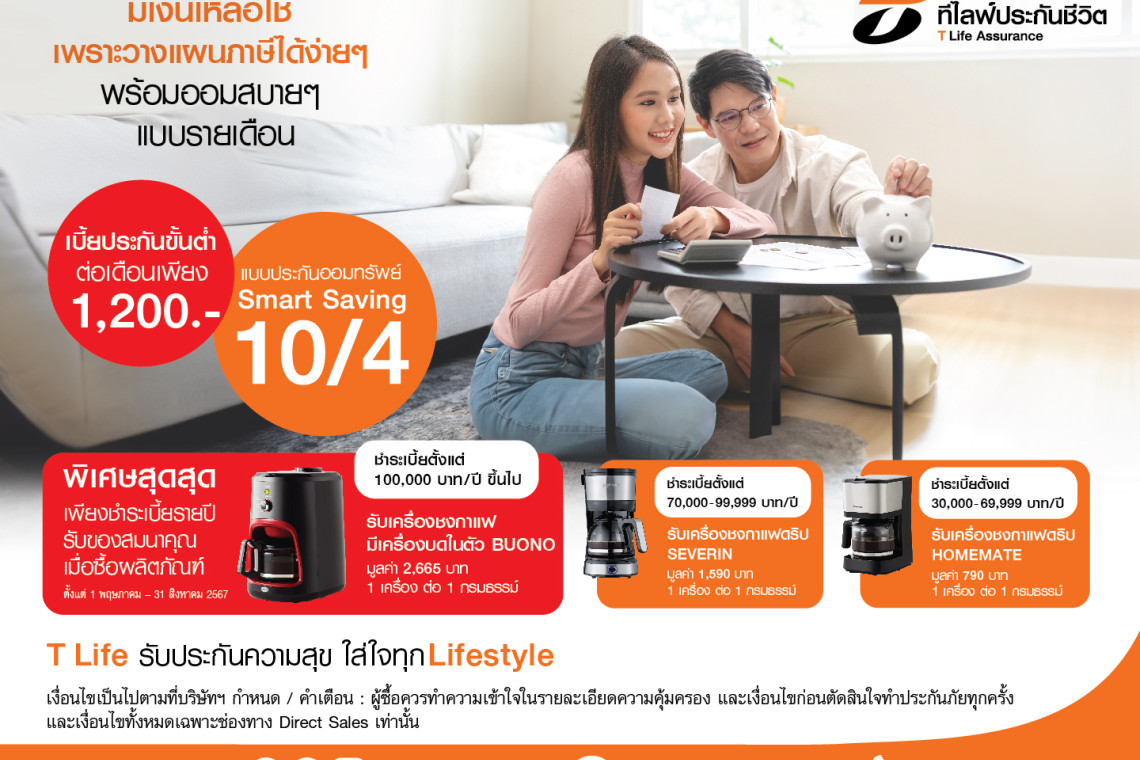 ที ไลฟ์ ประกันชีวิต เจาะช่องทางไดเร็คเซลล์ใช้พนักงานขายทำงานเชิงรุก ขายแบบประกันลดหย่อนภาษี “ประกันออมทรัพย์ Smart Saving 10/4” ที่ให้ผลตอบแทนคุ้มค่า ชำระเบี้ยประกันสั้นเพียง 4 ปี คุ้มครองนาน 10 ปี รับเงินคืนทุกปีสูงสุด 6% ครบกำหนดสัญญารับ 410% รวมเงินคืนตลอดสัญญา 460% ของจำนวนเงินเอาประกันภัย พร้อมรับของสมนาคุณพิเศษ ฟรี! เครื่องชงกาแฟมูลค่าสูงสุด 2,665 บาท เมื่อซื้อกรมธรรม์ตามเงื่อนไขที่กำหนด ตั้งแต่วันนี้ – 31 สิงหาคม 2567