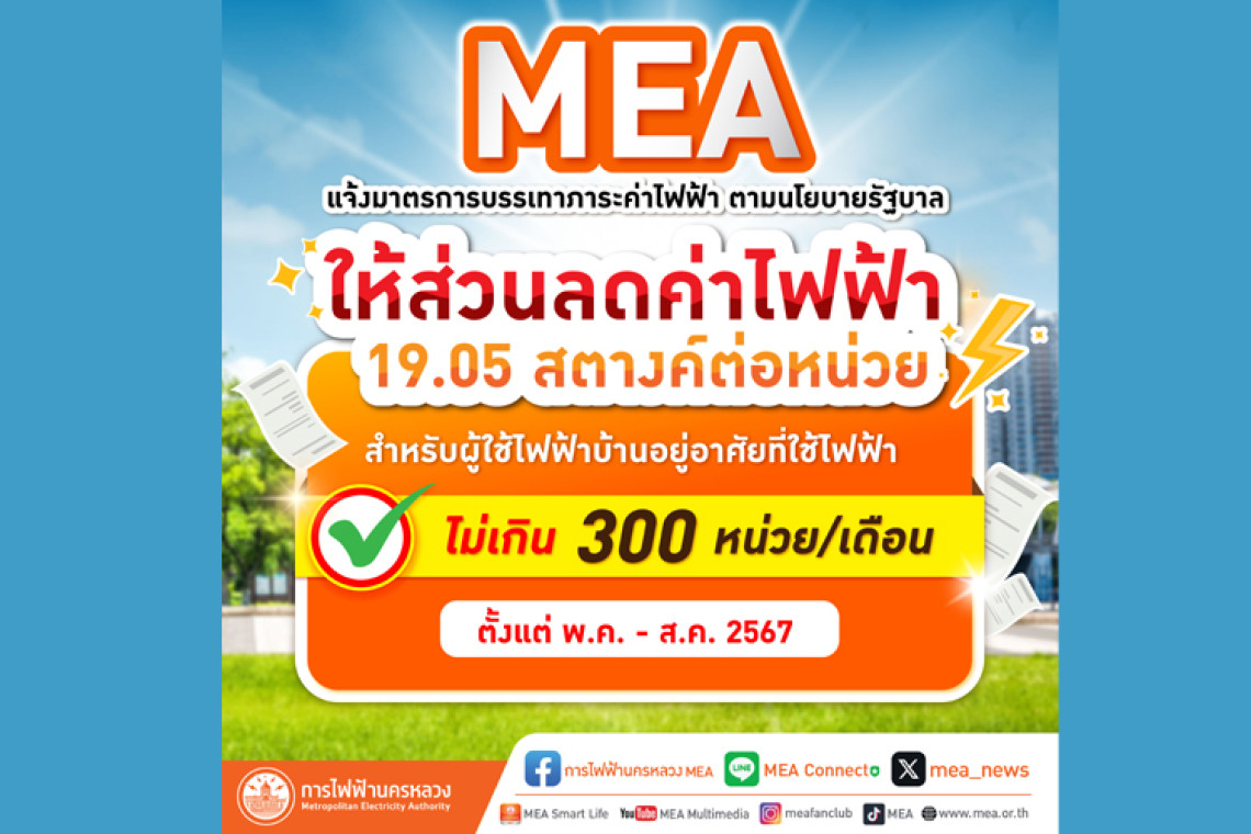 MEA แจ้งมาตรการบรรเทาภาระค่าไฟฟ้า ตามนโยบายรัฐบาล ให้ส่วนลดค่าไฟฟ้า 19.05 สตางค์ต่อหน่วย แก่ผู้ใช้ไฟฟ้าบ้านอยู่อาศัยที่ใช้ไฟฟ้าไม่เกิน 300 หน่วยต่อเดือน ตั้งแต่ พ.ค. – ส.ค. 2567