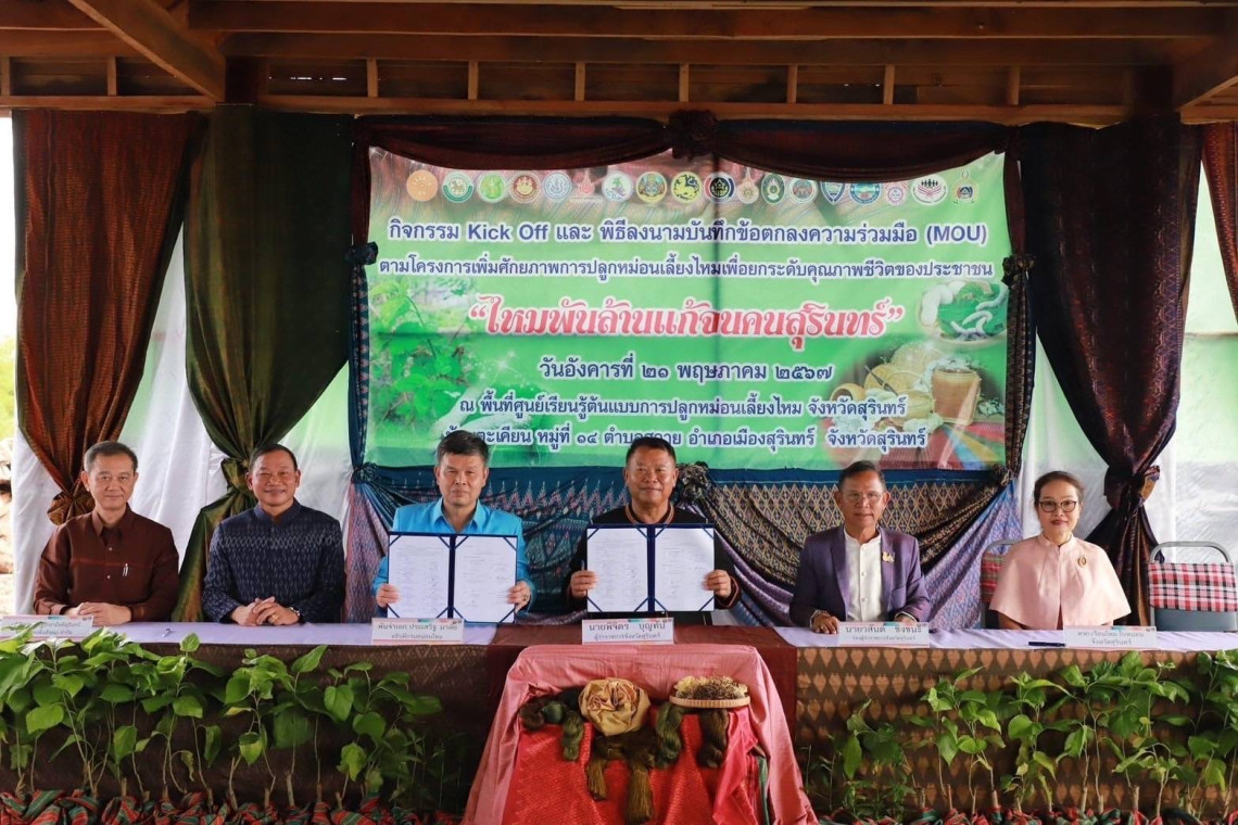 โดยกรมหม่อนไหมได้สนับสนุนหม่อนพันธุ์ดี จำนวน 269,000 ต้น ให้แก่ที่ปรึกษาและประธานศูนย์เรียนรู้ต้นแบบการปลูกหม่อนเลี้ยงไหมระดับจังหวัด นายอำเภอทุกอำเภอในจังหวัดสุรินทร์ พร้อมเป็นหน่วยงานในการลงนามบันทึกข้อตกลงความร่วมมือ (MOU) ดังกล่าวที่จะสนับสนุนด้านองค์ความรู้ วิชาการ และปัจจัยการผลิต