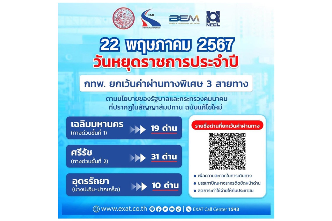 ทั้งนี้ ผู้ใช้ทางพิเศษสามารถสอบถามข้อมูลการเดินทาง สภาพการจราจร และขอความช่วยเหลือจากศูนย์บริการข้อมูลผู้ใช้ทางพิเศษ EXAT Call Center โทร 1543 ได้ตลอด 24 ชั่วโมง