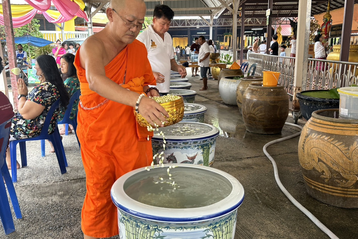 ประชาชนแห่อาบน้ำมนต์ ขึ้น 15 ค่ำ เดือน 6 "วัดไผ่เหลือง" ประจำปี 2567 เสริมดวง เสริมบารมี ปัดเป่าสิ่งไม่ดี แก้ปีชง กลับร้ายกลายเป็นดี โดยในวันนี้มีผู้ที่เข้าร่วมพิธีกว่า 400 คน โดยต้องรับบัตรคิว จากนั้นป็น การเริ่มพิธีในเวลา 13.16 น.