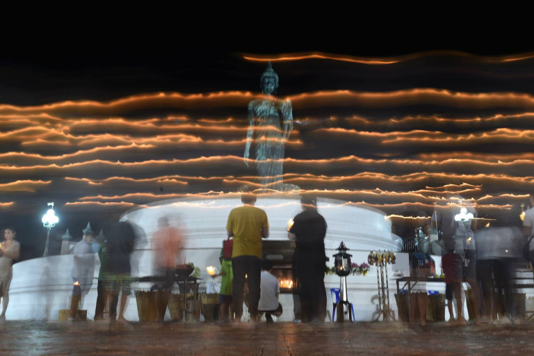 พุทธศาสนิกชนผู้ที่เลื่อมใสศรัทธาในพระพุทธศาสนาพร้อมใจกันนุ่งขาวห่มขาวร่วมเวียนเทียนในช่วงค่ำ รอบ องค์พระศรีศากยะทศพลญาณประธานพุทธมณฑลสุทรรศน์ อำเภอพุทธมณฑล จังหวัดนครปฐม