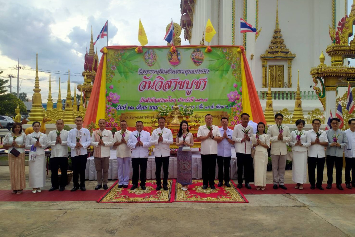 ในพิธี รองผู้ว่าราชการจังหวัดร้อยเอ็ด ประธานในพิธี จุดธูปเทียนบูชาพระรัตนตรัย พิธีกร อาราธนาศีล ประธานสงฆ์ให้ศีล ประธานในพิธี จุดเทียนส่องธรรม ประธานสงฆ์ แสดงพระธรรมเทศนา เรื่อง สิ่งที่ได้ในวันวิสาขบูชาคือหลักสากลในการแก้ไขปัญหาตามแนวทางของสมเด็จพระสัมมาสัมพุทธเจ้าได้แก่อริยสัจ 4 ได้แก่ ทุกข์ สมุทัยนิโรธ มรรค เป็นต้น และเจริญจิตภาวนา ประธานในพิธี และแขกผู้มีเกียรติ ถวายจตุปัจจัยพร้อมเครื่องไทยธรรม จำนวน 10 ชุด พระสงฆ์อนุโมทนา ประธานกรวดน้ำรับพร