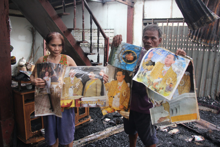 นายอำเภอห้วยราช จ.บุรีรัมย์ นำสิ่งของมอบช่วยเหลือ และสำรวจดูสภาพบ้านไม้ 2 ชั้นครึ่งปูนครึ่งไม้ ของ 2 ผัวเมียพ่อค้าขายผัก ที่ถูกไฟไหม้เมื่อคืนที่ผ่านมา เสียหายวอดทั้งหลัง แทบไม่เชื่อสายตา บ้านถูกไฟไหม้วอดทั้งหลัง แต่พระบรมฉายาลักษณ์ ในหลวง ร.9-ร.10 กลับไม่ไหม้ ทั้งๆที่ข้าวของเครื่องใช้อื่นอยู่ใกล้เคียงถูกไหม้วอดทั้งหมด และไม่มีผู้ได้รับอันตราย เชื่อเป็นความศักดิ์สิทธิ์ และผลบุญที่ทั้ง 2 ผัวเมียกราบไหว้บูชา พระบรมฉายาลักษณ์ฯ เป็นประจำ