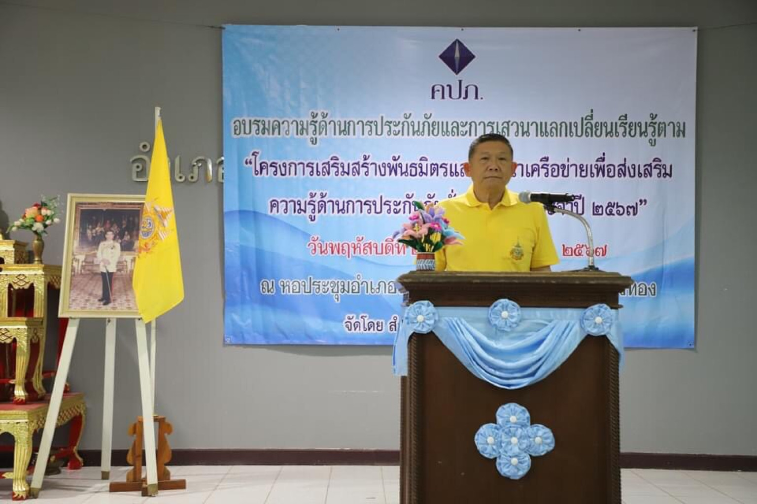 สำนักงานคณะกรรมการกำกับและส่งเสริมการประกอบธุรกิจประกันภัย (คปภ.) จังหวัดอ่างทอง ซึ่งเป็นหน่วยงานของรัฐ ที่มีบทบาทหน้าที่ในการกำกับ ดูแล และคุ้มครองสิทธิประโยชน์ ของประชาชน ด้านประกันภัย ได้จัดกิจกรรมตาม “โครงการสร้างสัมพันธมิตรและพัฒนาเครือข่ายเพื่อส่งเสริมความรู้ด้านการประกันภัยทั่วประเทศ ประจำปี 2567” โดยมีวัตถุประสงค์ เพื่อส่งเสริมความรู้ความเข้าใจเกี่ยวกับการประกันภัยให้กับบุคลากรของ กรมการปกครองกระทรวงมหาดไทย ได้แก่ กำนัน ผู้ใหญ่บ้าน ผู้ช่วยผู้ใหญ่บ้าน และสารวัตรกำนัน ให้มีความรู้ความเข้าใจเกี่ยวกับการประกันภัย และสามารถนำความรู้ไปเผยแพร่ประชาสัมพันธ์ ให้แก่ประชาชนในชุมชน ให้สามารถใช้สิทธิจากประกันภัยได้อย่างถูกต้อง เป็นธรรม และใช้การประกันภัยเป็นเครื่องมือในการบริหารความเสี่ยงในชีวิต และทรัพย์สิน ได้อย่างถูกต้อง และเหมาะสม