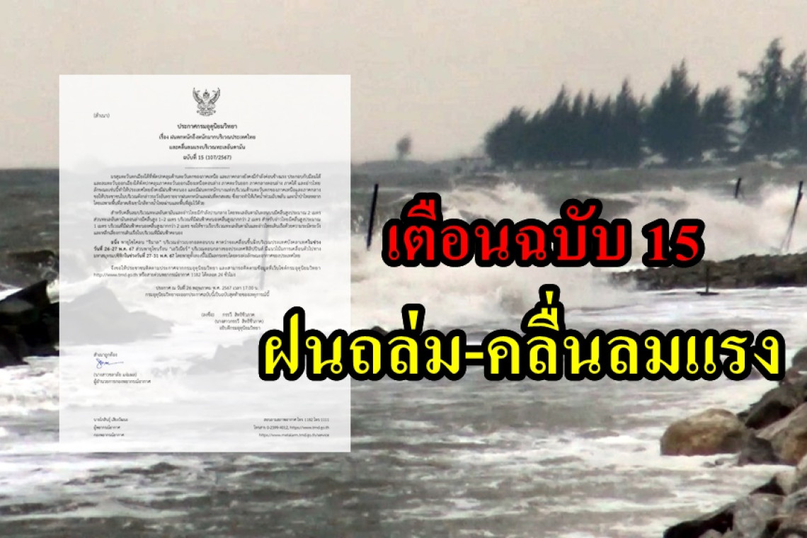 วันที่ 26 พ.ค.67 กรมอุตุนิยมวิทยา ประกาศฉบับที่ 15 เรื่อง ฝนตกหนักถึงหนักมากบริเวณประเทศไทย และคลื่นลมแรงบริเวณทะเลอันดามัน ความว่า...