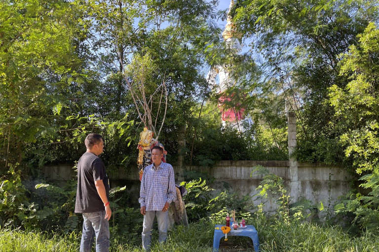 นายวิเชียร การสังเวช ผู้ใหญ่หมู่ 7 ต.ห้วยใหญ่ เล่าว่า สถานที่แห่งนี้ถูกปล่อยรกร้างมานานร่วม 5 ปี โดยมีกลุ่มคนจีน เข้ามาสร้าง เพื่อทำเป็นแหล่งท่องเที่ยว ซึ่งช่วงในระหว่างก่อสร้างตนเองก็ไม่ได้เข้าไปดู หรือ ยุ่งเกี่ยวอะไร แต่รู้ว่า หลังจากสร้างเสร็จ มีดารา นักร้อง คนดัง มาร่วมงานจำนวนมาก ต่อมาเกิดการระบาดโควิอย่างหนัก สถานที่ก็ถูกปล่อยทิ้งให้รกร้างตั้งแต่นั้นมา โดยล่าสุด มีลูกบ้านเข้าไปแจ้งว่า มีผู้มาพังกำแพงสังกะสี  แล้ว นำเศษปูนเข้ามาทิ้ง ซึ่งตนเองได้เข้ามาตรวจสอบ ตามลูกบ้านร้อง แต่ก็ได้เข้ามาดูเท่านั้น ที่ผ่านมา ตนเองยอมรับว่า ที่นี้มีเสียงร่ำลือว่าศักดิ์สิทธิ์ ใครมาขออะไรก็ได้ ทั้งเรื่องโชคลาภ จนถูกหวยหลายงวดติด และ  บ้านไหนมีเด็กป่วย มาขอก็จะหายป่วย ที่ผ่านมา มีผู้คนมากมาย มากราบไหว้ ขอพร ไม่ขาดสาย