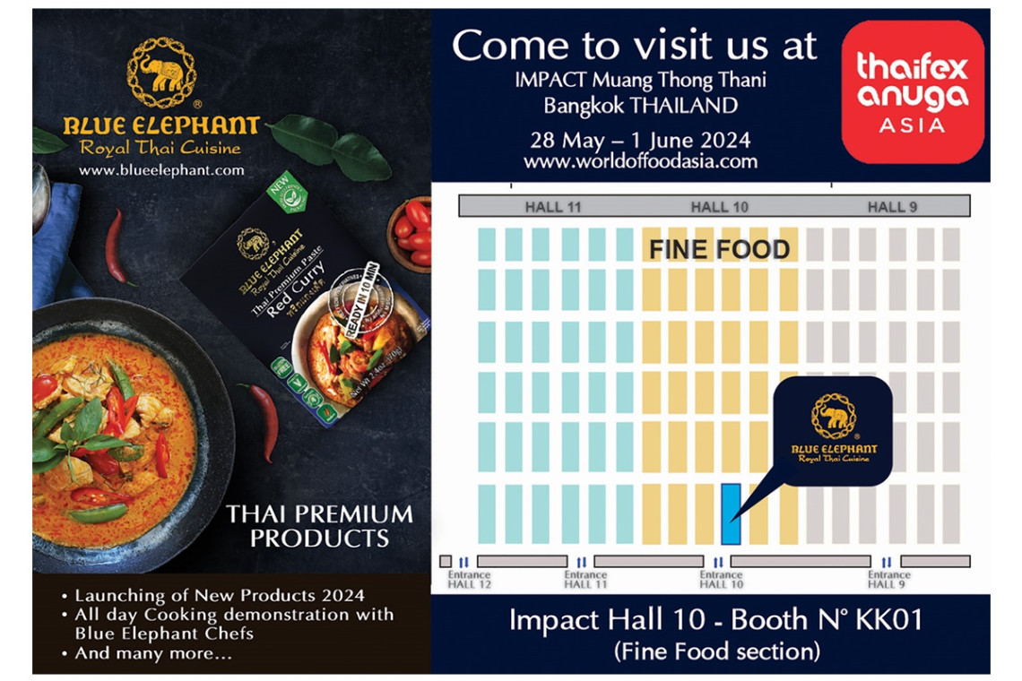 บริษัท บลู สไปซ์ จำกัด ซึ่งเป็นบริษัทผู้ผลิตและจัดจำหน่ายผลิตภัณฑ์แบรนด์ “บลู เอเลเฟ่นท์” ในเครือ บลู เอเลเฟ่นท์ กรุ๊ป เตรียมจัดแสดงนวัตกรรมอีกครั้ง ที่โดดเด่นและกว้างขวาง สะท้อนถึงแก่นแท้ของวัฒนธรรมไทย ที่บริษัทมุ่งมั่นส่งเสริมอาหารไทยต้นตำรับ ด้วยการจัดแสดงอาหารไทยแท้ๆ เพื่อสนับสนุนให้ประเทศไทยเป็นจุดหมายปลายทางที่เต็มไปด้วยมรดกทางวัฒนธรรม ณ ฮอลล์ 10 บูธ KK01 ภายในงาน “THAIFEX-Anuga Asia 2024” งานแสดงสินค้าอาหารและเครื่องดื่มที่ใหญ่และครบวงจรที่สุดในภูมิภาคเอเชีย ระหว่างวันที่ 28 พฤษภาคมถึง 1 มิถุนายน 2567 ณ อิมแพค เมืองทองธานี กรุงเทพฯ