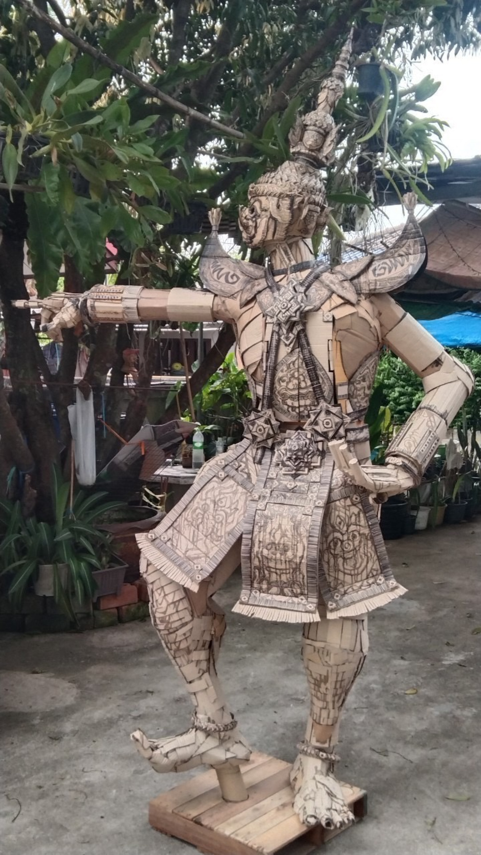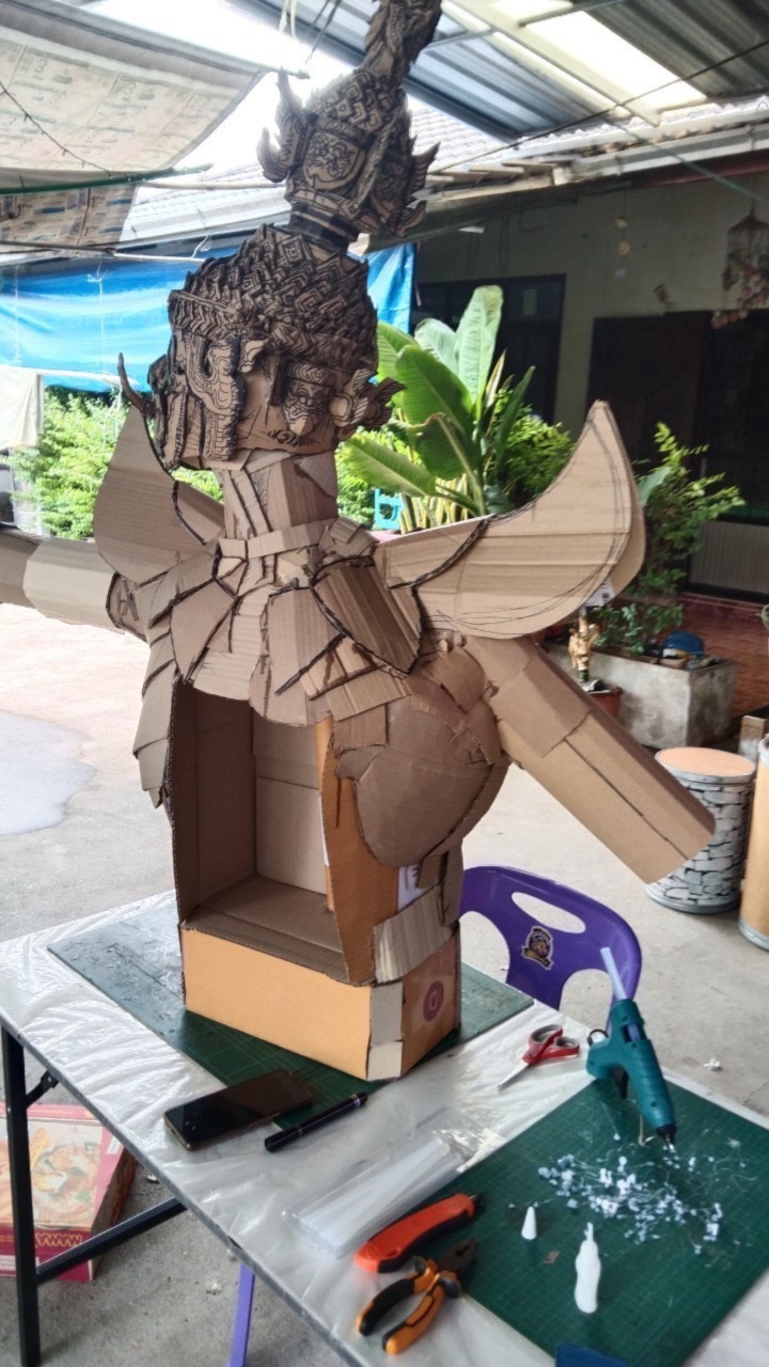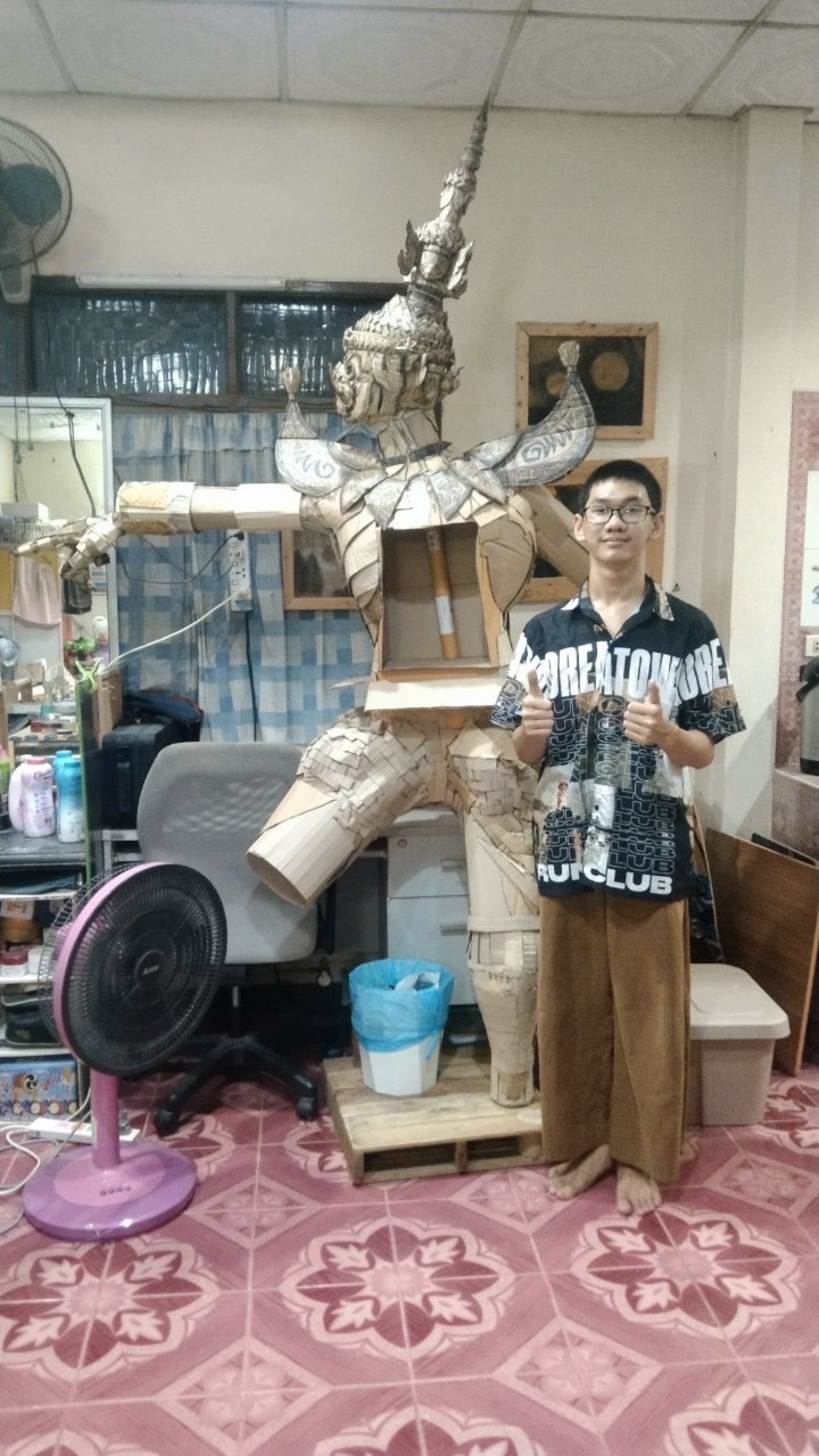 ต่อมาผู้สื่อข่าวได้พูดคุยกับนายนันทิพัฒน์ จันนา อายุ 17 ปีนักเรียนชั้น ม.6 โรงเรียนนครนายกวิทยาคม ได้เล่าถึงการสร้างหุ่น“ ทศกัณฐ์”นี้ว่า ตนเองมีความชื่นชอบในเรื่องราวของรามเกียรติ์ เมื่อก่อนเคยทำหัวโขนจากกระดาษแต่แค่เป็นงานเล็กๆ ประมาณ 3-4 ชิ้น ครั้งนี้อยากลองทำอะไรที่ใหญ่กว่าเดิมจึงมีแนวคิดลองทำหุ่นที่เป็นตัว “ทศกัณฐ์”นี้ขึ้นมา ซึ่งเป็นการท้าทายความสามารถตัวเองไปในตัวด้วย และยังเป็นวิธีการบริหารเวลาว่างของผมให้มีความสุขโดยใช้วัสดุจากกล่องกระดาษทำขึ้นมา โดยมีความสูงที่ 2.70 เมตร ใช้แกนกระดาษเป็นโครงด้านในของตัว ”ทศกัณฐ์“ใช้เวลาถึง 12 วันช่วงปิดเทอมทำ ถึงได้สร้างเสร็จ แล้วนำมาโชว์ที่โรงเรียนให้เพื่อนๆได้ดูกันในวันที่เปิดเทอม