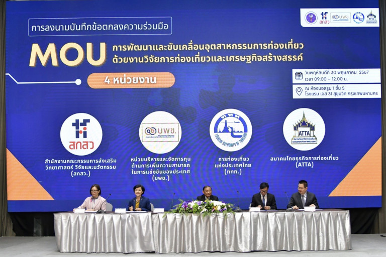 สำนักงานคณะกรรมการส่งเสริมวิทยาศาสตร์ วิจัยและนวัตกรรม (สกสว.) หน่วยบริหารและจัดการทุนด้านการเพิ่มความสามารถในการแข่งขันของประเทศ (บพข.) ร่วมกับ การท่องเที่ยวแห่งประเทศไทย (ททท.) และสมาคมไทยธุรกิจการท่องเที่ยว (ATTA) จัดพิธีลงนามบันทึกข้อตกลงความร่วมมือ (MOU) “การพัฒนาและขับเคลื่อนอุตสาหกรรมการท่องเที่ยว ด้วยงานวิจัยการท่องเที่ยวและเศรษฐกิจสร้างสรรค์” ทั้ง 4 หน่วยงานในเป้าหมายสำคัญที่จะร่วมมือกันสนับสนุนการพัฒนาและขับเคลื่อนอุตสาหกรรมการท่องเที่ยว การตลาดภาคการท่องเที่ยวและบริการ ด้วยวิทยาศาสตร์ วิจัยและนวัตกรรม เพื่อยกระดับศักยภาพของอุตสาหกรรมการท่องเที่ยวตลอดห่วงโซ่คุณค่า (Value Chain) อย่างยั่งยืนบนฐานทรัพยากรของประเทศ และสอดคล้องตามแผนวิทยาศาสตร์ วิจัยและนวัตกรรม พ.ศ. 2566-2570 (ววน.) ในด้านการพัฒนาการท่องเที่ยวและเศรษฐกิจสร้างสรรค์ ตามแนวทางการพัฒนาระบบเศรษฐกิจชีวภาพ-เศรษฐกิจหมุนเวียน-เศรษฐกิจสีเขียว (Bio-Circular-Green Economy: BCG) ในด้านการท่องเที่ยวให้เป็นระบบเศรษฐกิจมูลค่าสูง มีความยั่งยืนและเพิ่มรายได้ของประเทศ ผ่านการทำงานและขับเคลื่อนร่วมกันตามบทบาทภารกิจของแต่ละหน่วยงาน โดยใช้กลไกการสนับสนุนงบประมาณวิจัยที่มีโจทย์ความต้องการของภาคเอกชน เพื่อให้เกิดผลงานวิจัยไปใช้ประโยชน์อย่างเป็นรูปธรรมและเกิดผลกระทบในวงกว้าง โดยมีนายเสริมศักดิ์ พงษ์พานิช รัฐมนตรีว่าการกระทรวงการท่องเที่ยวและกีฬา เป็นประธานในพิธี ณ ห้องบอลรูม 1 ชั้น 5 โรงแรม เอส 31 สุขุมวิท กรุงเทพมหานคร 30 พฤษภาคม 2567