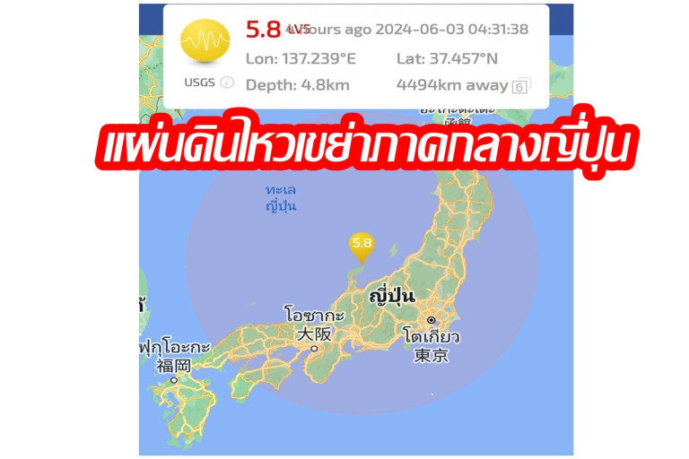 ระทึก! แผ่นดินไหว 5.9 แมกนิจูดเขย่าภาคกลางญี่ปุ่น ไม่มีเตือนภัยสึนามิ