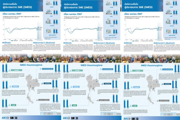 ดัชนีความเชื่อมั่นผู้ประกอบการ SME (SMESI) คาดการณ์ยังพุ่งต่อเนื่องหลังสงกรานต์ที่ผ่านมาคึกคัก หนุน SMESI เมษายน 2567 พุ่งสูงขึ้น โดยเฉพาะภาคบริการขยายตัวได้ดี แต่ภาคการผลิตกลับชะลอตัวลงจากวันหยุด ส่วนภาคธุรกิจการเกษตรชะลอตัวลงจากความแปรปรวนของสภาพอากาศ
