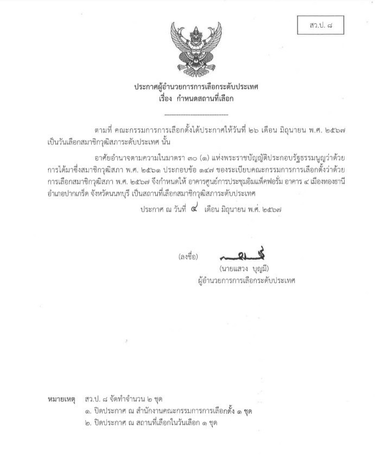 ขณะที่การเลือกระดับประเทศ  วันที่ 26 มิ.ย.ใช้อาคารศูนย์การประชุมอิมแพ็คฟอรั่ม อาคาร 4 เมืองทองธานี   อำเภอปากเกร็ด จังหวัดนนทบุรี