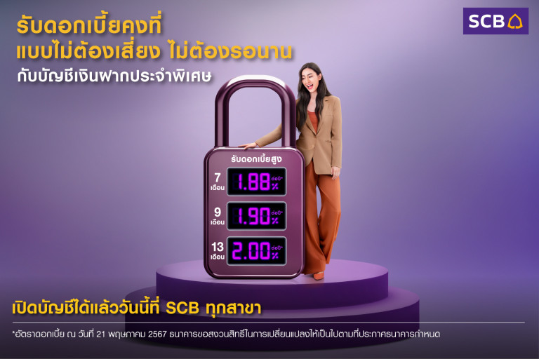 ธนาคารไทยพาณิชย์ เดินหน้าส่งเสริมการออมเงินที่ช่วยลดความกังวลเรื่องอัตราดอกเบี้ยผันผวน ล่าสุดส่ง “บัญชีเงินฝากประจำพิเศษ” รับดอกเบี้ยแบบคงที่ในอัตราแน่นอนแบบไร้ความเสี่ยง สูงสุดถึง 2.00% ต่อปี ไม่ต้องรอผลตอบแทนนานเหมือนผลิตภัณฑ์การลงทุนอื่นๆ สามารถเลือกระยะเวลาการฝากเงินได้ตามใจตั้งแต่ระยะสั้นถึงระยะกลาง จ่ายดอกเบี้ยเมื่อครบกำหนดระยะเวลาการฝาก สะดวกต่ออายุอัตโนมัติโดยที่ลูกค้าไม่ต้องมาทำรายการที่สาขา และมั่นใจในความปลอดภัยด้วยความคุ้มครองจากสถาบันคุ้มครองเงินฝากตามจำนวนที่กำหนดไว้ตามกฎหมาย เพียงเปิดบัญชีขั้นต่ำเพียง 1,000 บาท ฝากได้ไม่จำกัด ไม่ว่าจะฝากมากหรือน้อยก็สามารถรับผลตอบแทนคุ้มค่าได้ ตอบโจทย์กลุ่มลูกค้าเงินฝากที่มุ่งเน้นการสร้างโอกาสในการมีเงินสั่งสมอย่างสม่ำเสมอ โดยลูกค้าสามารถเปิดบัญชีเงินฝากประจำพิเศษได้ง่ายๆ ที่สาขาธนาคารไทยพาณิชย์ทั่วประเทศ ตั้งแต่วันที่ 21 พฤษภาคม 2567 เป็นต้นไป