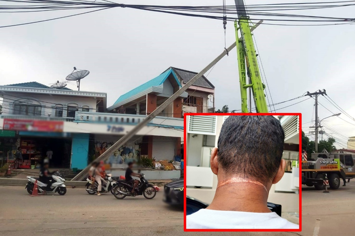 เมื่อเวลา 13.30 น. วันที่ 5 มิ.ย.67 บนถนนเส้นสายเทศบาล 1 ก่อนถึงวัดห้วยใหญ่ อ.บางละมุง จ.ชลบุรีในขณะที่ นายนิวัฒน์ เกตุแจ้ อายุ 42 ปี ขี่รถ จยย.มาทำธุระบนถนนเส้นดังกล่าว ได้พบผู้รับเหมาการไฟฟ้าส่วนภูมิภาคนาจอมเทียน กำลังตั้งเสาไฟฟ้าโดยมีเจ้าหน้าที่ออกมายืนให้สัญญาณปิดถนนไม่ให้รถทุกชนิดผ่าน เพื่อทำการยกเสาไฟฟ้าขึ้น แต่เกิดความผิดพลาดในการยกเสา ทำให้เสาไฟฟ้าร่วงหล่นลงมาทับสายสื่อสาร และเป็นช่วงเดียวกับที่เจ้าหน้าที่ได้ปล่อยให้รถผ่านได้ จึงทำให้สายสื่อสารเหวี่ยงมาเกี่ยวรัดคอของนายนิวัฒน์ โชคดีที่เป็นจังหวะขณะเคลื่อนรถออกมาแบบช้าๆ หากขับขี่มาด้วยเร็วคงไม่น่ามีชีวิต รอดเป็นแน่