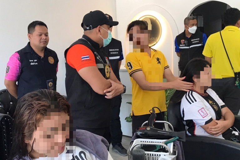 เมื่อวันที่ 6 มิ.ย.67 เจ้าหน้าที่ตำรวจ-ฝ่ายปกครองอำเภอเกาะพงัน เจ้าหน้าที่ชุดจับกุมประกอบด้วย ฝ่ายปกครองอำเภอเกาะพงัน,เจ้าหน้าที่ตำรวจตรวจคนเข้าเมือง และตำรวจท่องเที่ยว โดยเจ้าหน้าที่ ตม.จว.สุราษฎร์ธานี ภายใต้การอำนวยการของ พ.ต.อ.นฤวัต พุทธวิโร ผกก.ตม.จว.สุราษฎร์ธานี, ร.ต.อ.สิทธิชัย ชำสุข รอง สว.ตม.จว.สุราษฏร์ธานี, ร.ต.อ.สิวัฒน์ สมหวัง รอง สว.ตม.จว.สุราษฎร์ธานี, ด.ต.สุดรัก อวยศิลป์, ส.ต.ท.กสิณ วิภาดาพิสุทธิ์ และ ส.ต.ท.หญิง ธันยพร เวนสคูนาส ผบ.หมู่ ตม.จว.สุราษฎร์ธานี เจ้าหน้าที่ฝ่ายปกครองอำเภอเกาะพะงัน ภายใต้การอำนวยการของ นายนพดล ขาวมะลิ นายอำเภอเกาะพะงัน,นายสุทธิพงษ์ ทองเรือง ปลัดอำเภอหัวหน้ากลุ่มงานบริหารงานปกครอง นำโดย มว.ต.อัครพล พูลผล ปลัดอำเภอฝ่ายความมั่นคง, ม.ต.สิทธิศักดิ์ เจริญจันทร์, ม.ต.พงศภัคร ไทยบุรี, อส.อ.ทวิช ศรีทองกุล, อส.ต.ธันวา สุวรรณเสน และ อส.ต.ธีรยุทธ พรหมศิลป์ เจ้าหน้าที่ ส.ทท.5 กก.2 บก.ทท.3 ภายใต้การอำนวยการของพ.ต.ท.วินิจ บุญชิต สว.ส.ทท.5 กก.2 บก.ทท.3 นำโดย ด.ต.สายัณห์ สุทธิมาศ และ ส.ต.ท.ธนายุส เวชสุวรรณ ผบ.หมู่ ส.ทท.5 กก.2 บก.ทท.3 เจ้าหน้าที่ สภ.เกาะพะงัน ภายใต้การอำนวยการของ พ.ต.อ.ปัญญา นิรัติมานนท์ ผกก.สภ.เกาะพะงัน นำโดย พ.ต.ท.ชัยยุทธ์ คงแก้ว รอง ผกก.ป.ส.ภ.เกาะพะงัน และ พ.ต.ท.ชัยยัน ชูแก้ว สวป.สภ.เกาะพะงัน ได้สั่งการให้ชุดจับกุม เจ้าพนักงานฝ่ายปกครองอำเภอเกาะพะงัน นำโดย มว.ต.อัครพล พูลผล ปลัดอำเภอฝ่ายความมั่นคง/ผช.ผบ.ร้อย อส.อ.เกาะพะงัน,ตำรวจตรวจคนเข้า เมือง เกาะพะงัน นำโดย ร.ต.อ.สิริวัฒน์ สมหวัง,ตำรวจท่องเที่ยว เกาะพะงัน นำโดย ด.ต.สายัณห์ สุทธิมาศ,ตำรวจ สภ.เกาะพะงัน นำโดย พ.ต.ท.ชัยยัน ชูแก้ว เข้าตรวจสอบการทำงานของชาวต่างชาติ แรงงานข้ามชาติ แย่งอาชีพคนไทย กรณีได้รับเรื่องร้องเรียน มีคนต่างด้าวแรงงานชาวเมียนมาลักลอบทำร้านเสริมสวยหรูครบวงจรในพื้นที่เกาะพะงัน แย่งอาชีพคนไทยอยู่ ภายใน ตลาดมิสเตอร์เก่ง หมู่ที่ 2 อ.เกาะพะงัน จว.สุราษฎร์ธานี