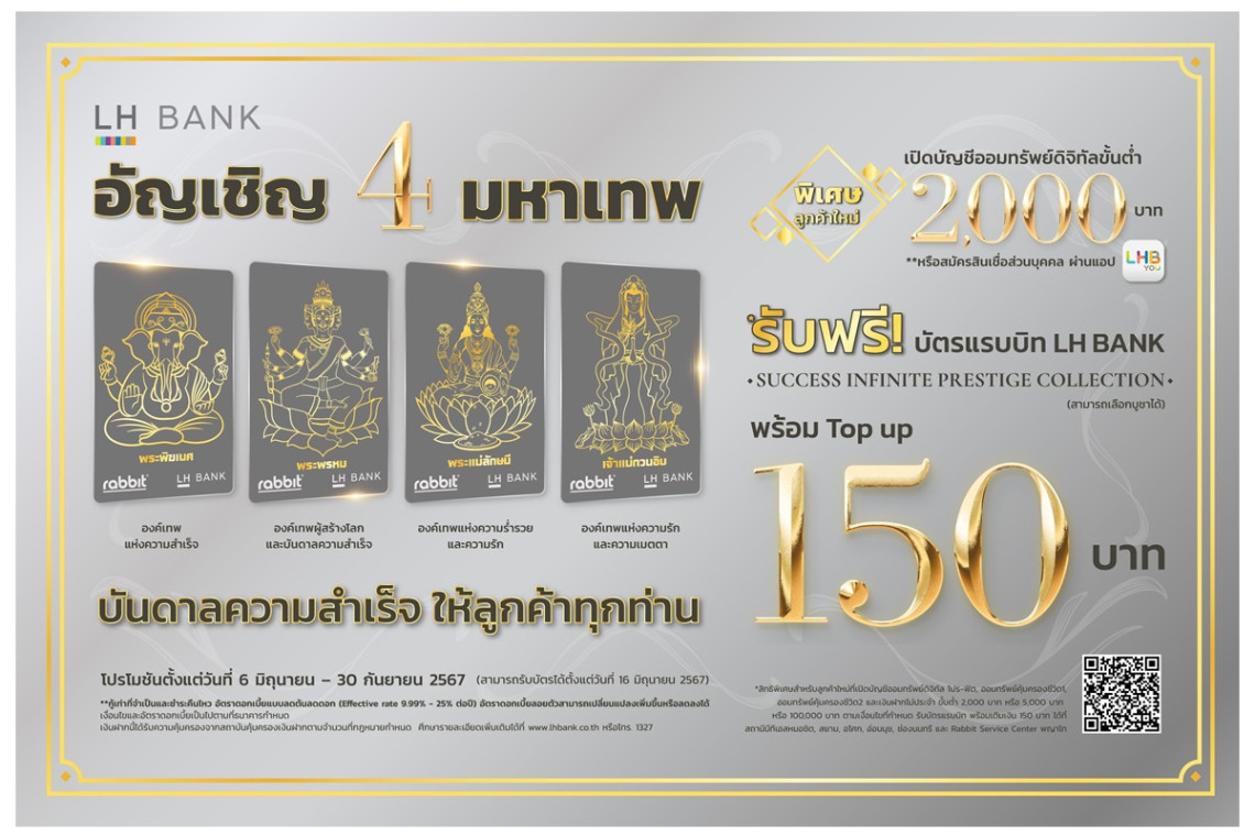 ธนาคารแลนด์ แอนด์ เฮ้าส์ จำกัด (มหาชน) หรือ LH Bank โดย นายฉี ชิง-ฟู่ ประธานเจ้าหน้าที่บริหารและกรรมการผู้จัดการ เปิดเผยว่า ธนาคารออกแคมเปญพิเศษเอาใจลูกค้าทุกท่าน โดยเฉพาะสายมูที่ต้องการเสริมสิริมงคลให้ชีวิตราบรื่น มีความสำเร็จทุกด้านด้วยบัตรแรบบิท LH Bank Success Infinite Prestige Collection 4 มหาเทพ ที่จะบันดาลความสำเร็จพร้อมให้ลูกค้า สามารถพกพาไปทุกที่เสมือนมีองค์เทพเสริมดวงอวยพรในทุกการใช้จ่ายและการเดินทาง
