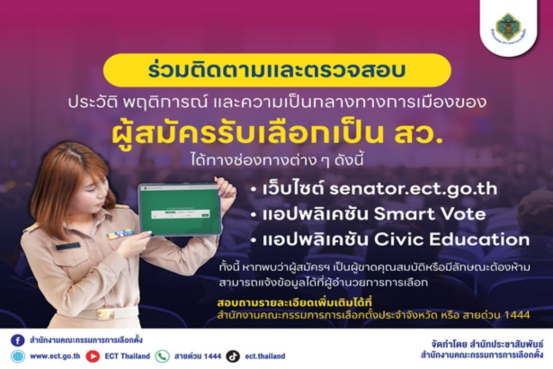 เมื่อวันที่ 13 มิ.ย.67 สำนักงานคณะกรรมการการเลือกตั้งขอเชิญชวนประชาชนร่วมติดตามและตรวจสอบประวัติ พฤติการณ์ และความเป็นกลางทางการเมืองของผู้สมัครรับเลือกเป็นสมาชิกวุฒิสภา (สว.)