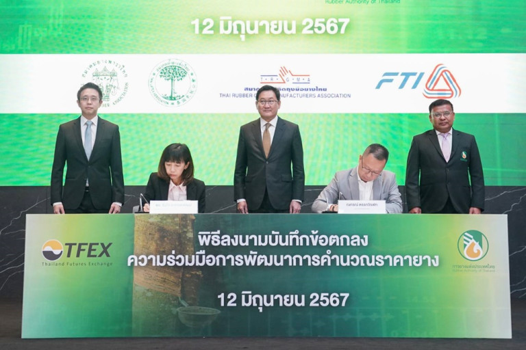 ที่หอประชุมศุกรีย์ แก้วเจริญ ตลาดหลักทรัพย์แห่งประเทศไทย การยางแห่งประเทศไทย (กยท.) จับมือ บริษัท ตลาดสัญญาซื้อขายล่วงหน้า (ประเทศไทย) จำกัด (มหาชน) (TFEX) ผสานความร่วมมือ “การพัฒนาการคำนวณราคายาง” เพื่อเป็นราคาอ้างอิงของไทย สำหรับซื้อขายยางเพื่อส่งออกต่างประเทศ มีมาตรฐาน โปร่งใส ตรวจสอบได้ สร้างความเชื่อมั่นแก่ผู้เกี่ยวข้องในอุตสาหกรรมยางพารา โดยมี นายณกรณ์ ตรรกวิรพัท ผู้ว่าการ กยท. และ ดร.รินใจ ชาครพิพัฒน์ กรรมการผู้จัดการ TFEX เป็นผู้ลงนามบันทึกข้อตกลงความร่วมมือครั้งนี้