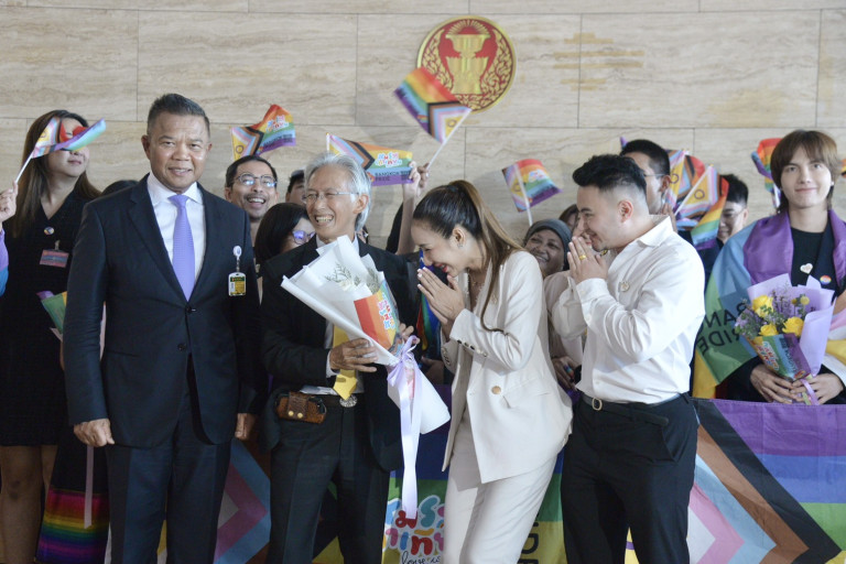วันที่ 18 มิ.ย. 67 เวลา 15.15 น. ที่รัฐสภา เครือข่ายภาคประชาชน กลุ่ม LGBTQIAN+ มอบช่อดอกไม้ เพื่อเป็นการขอบคุณ นายวัลลภ ตังคณานุรักษ์ ประธานคณะกรรมาธิการการพัฒนาสังคม และกิจการเด็ก เยาวชน สตรี ผู้สูงอายุ คนพิการ และผู้ด้อยโอกาส วุฒิสภา และตัวแทนพรรคการเมือง อาทิ นายพิธา ลิ้มเจริญรัตน์ สส.พรรคก้าวไกล นายกัณวีร์ สืบแสง สส.พรรคเป็นธรรม นายชัชวาล แพทยาไทย สส.พรรคไทยสร้างไทย รศ.พิเศษดวงฤทธิ์ เบ็ญจาธิกุล ชัยรุ่งเรือง สส.พรรครวมไทยสร้างชาติ และนายอัครนันท์ กัณณ์กิตตินันท์ สส.พรรคเพื่อไทย รับมอบช่อดอกไม้เพื่อแสดงความขอบคุณจากภาคประชาชน ที่ช่วยผลักดันและสนับสนุนกฎหมายสมรสเท่าเทียม จนผ่านความเห็นชอบจากทั้ง 2 สภาในวันนี้ ที่ประชุมวุฒิสภามีมติเห็นชอบร่าง พ.ร.บ.แก้ไขเพิ่มเติมประมวลกฎหมายแพ่งและพาณิชย์ (ฉบับที่ ..) พ.ศ. .... หรือร่างกฎหมายสมรสเท่าเทียม วาระที่ 3 ด้วยคะแนนเสียง เห็นชอบ 130 เสียง ไม่เห็นชอบ 4 เสียง และงดออกเสียง 18 เสียง