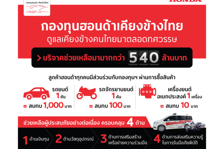 กองทุนฮอนด้าเคียงข้างไทย โดยบริษัท ฮอนด้ามอเตอร์ จำกัด ร่วมกับ บริษัท ฮอนด้า ออโตโมบิล (ประเทศไทย) จำกัด และ บริษัท ไทยฮอนด้า จำกัด ขอขอบคุณลูกค้าฮอนด้าทุกท่านที่ได้ร่วมเป็นส่วนหนึ่งของ ‘กองทุนฮอนด้าเคียงข้างไทย’ ในการช่วยเหลือบรรเทาความเดือดร้อนแก่ประชาชนชาวไทยในยามต้องเผชิญสาธารณภัย มาตลอดระยะเวลา 11 ปี ผ่านการซื้อรถยนต์ รถจักรยานยนต์ และเครื่องยนต์อเนกประสงค์ฮอนด้า สำหรับยอดขายรถยนต์ 1 คัน เท่ากับการมอบเงินสมทบ 1,000 บาทยอดขายรถจักรยานยนต์ 1 คัน เท่ากับมอบเงินสมทบ 100 บาท และยอดขายเครื่องยนต์อเนกประสงค์ 1 เครื่อง เท่ากับการมอบเงินสมทบ 10 บาท โดยตลอดหนึ่งทศวรรษที่ผ่านมา ‘กองทุนฮอนด้าเคียงข้างไทย’ ได้ร่วมช่วยเหลือไปแล้วทั้งสิ้นรวมมูลค่ามากกว่า 540 ล้านบาท
