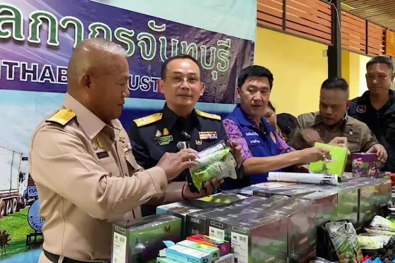 วันที่ 20 มิ.ย.67 นายพงษ์ศักดิ์ ธนะวัฒนานนท์ นายด่านศุลกากรจันทบุรี พร้อมด้วยนายกิตติพงษ์ กิติคุณ นายอำเภอเมืองจันทบุรี หน่วยงานความมั่นคงภายในจันทบุรี และฝ่ายปกครองอำเภอเมืองจันทบุรี นำของกลางบุหรี่ไฟฟ้า และอุปกรณ์ ที่เกี่ยวข้อง จำนวน 3,758 ชิ้น คิดเป็นมูลค่ารวมกว่า 1 ล้านบาท มาร่วมแถลงผลการจับกุม หลังจากที่ศุลกากรจันทบุรี ร่วมกับหน่วยงานความมั่นคง ไปลุยตรวจค้นจับกุมบุหรี่ไฟฟ้าลักลอบนำเข้า พบมีทั้งร้านจำหน่าย และโกดังเก็บสินค้า  ซึ่งการจับกุมครั้งนี้ถือเป็นล็อตใหญ่ที่สุดที่จับกุมได้