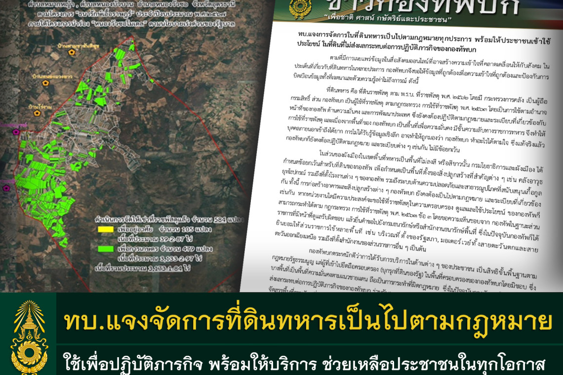 กองทัพบกตระหนักดีว่าการได้รับการบริการในด้านต่าง ๆ ของประชาชน เป็นสิทธิขั้นพื้นฐานตามกฎหมายรัฐธรรมนูญ แต่ผู้ที่เข้าไปยึดถือครอบครอง (บุกรุกที่ดินของรัฐ) ในพื้นที่ครอบครองของกองทัพบกโดยมิชอบ ซึ่งบางพื้นที่เป็นพื้นที่ความมั่นคงตามแนวชายแดน ถือเป็นการกระทำที่ผิดกฎหมาย ซึ่งในปัจจุบันกองทัพบก ได้นำที่ดินที่ไม่ส่งผลกระทบต่อการปฏิบัติภารกิจของกองทัพบก ร่วมกับกรมธนารักษ์ จัดทำโครงการ “ธนารักษ์เอื้อราษฎร์” ซึ่งเป็นการจัดสรรพื้นที่ราชพัสดุที่อยู่ในความรับผิดชอบของส่วนราชการต่างๆ นำมาให้ประชาชนใช้ประโยชน์ จึงขอให้ประชาชนที่สนใจสามารถเข้าร่วมโครงการและติดตามข่าวสารได้ที่สำนักงานธนารักษ์และหน่วยทหารในพื้นที่