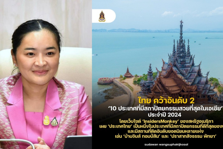 รองโฆษกประจำสำนักนายกรัฐมนตรี กล่าวว่า เว็บไซต์ Insider Monkey ของสหรัฐอเมริกาเปิดเผยการจัดอันดับ 10 ประเทศที่มีสถาปัตยกรรมสวยที่สุดในภูมิภาคเอเชีย โดย ประเทศไทย ได้รับการจัดอันดับที่ 2 รองจากสาธารณรัฐประชาชนจีน ทั้งนี้เว็บไซต์ระบุว่า ประเทศไทยในปี 2023 ต้อนรับนักท่องเที่ยวต่างชาติกว่า 28.15 ล้านคน และเป็นหนึ่งในประเทศในภูมิภาคเอเชียที่มีสถาปัตยกรรมที่ดีที่สุด นอกจากนี้ใน Trip Advisor ยังนำเสนอสถานที่ติดอันดับยอดนิยมหลายแห่งในประเทศ เช่น บ้านจิม ทอมป์สัน และปราสาทสัจธรรม อีกทั้งพัทยา ยังเป็นจุดหมายปลายทางยอดนิยมอันดับ 7 ของ Trip Advisor ในปี 2567 ด้วย