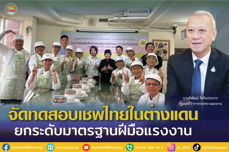 นายพิพัฒน์ รัชกิจประการ รัฐมนตรีว่าการกระทรวงแรงงาน เปิดเผยว่า รัฐบาลมีนโยบายการพัฒนาประเทศด้วยการขับเคลื่อนที่มุ่งเน้นการใช้ความคิดสร้างสรรค์ เทคโนโลยี และนวัตกรรม จากทุนทางวัฒนธรรม หรือ Soft Power โดยเฉพาะอย่างยิ่งวัฒนธรรมและบริการที่มีมูลค่าสูง ซึ่งอาหารไทยเป็นส่วนหนึ่งที่รัฐบาลส่งเสริมให้เป็นซอฟต์พาวเวอร์อันดับต้น ๆ ของประเทศ ประกอบกับกระทรวงแรงงานวางเป้าหมายสำคัญที่ต้องการให้แรงงานไทยทุกคนไม่ว่าจะทำงานอยู่ในประเทศไทยหรือต่างประเทศ ต้องได้รับการพัฒนาฝีมือแรงงาน Up Skill / Re Skill ให้มีทักษะฝีมือแรงงานชั้นสูงและได้มาตรฐานเป็นที่ยอมรับในระดับสากล การดำเนินการทดสอบมาตรฐานฝีมือแรงงาน ที่เป็นภารกิจหนึ่งของกระทรวงแรงงานโดยกรมพัฒนาฝีมือแรงงาน จึงควรดำเนินการทดสอบฝีมือให้กับแรงานไทยที่อยู่ในต่างประเทศด้วย เพื่อยกระดับทักษะฝีมือให้กับแรงงานไทย รวมถึงสร้างการยอมรับจากประเทศต่างๆ ที่รับแรงงานไทยเข้าไปทำงาน จึงมอบหมายให้กรมพัฒนาฝีมือแรงงาน จัดทดสอบมาตรฐานฝีมือแรงงานไทยในต่างประเทศ สาขาอาชีพต่างๆ ที่คนไทยเข้าไปทำงาน อาทิ การประกอบอาหารไทย พนักงานนวดไทย ซึ่งใบรับรองมาตรฐานฝีมือแรงงานที่แรงงานไทยได้รับ จะเป็นใบรับรองที่เพิ่มโอกาสในเรื่องของอัตราค่าจ้างอีกด้วย