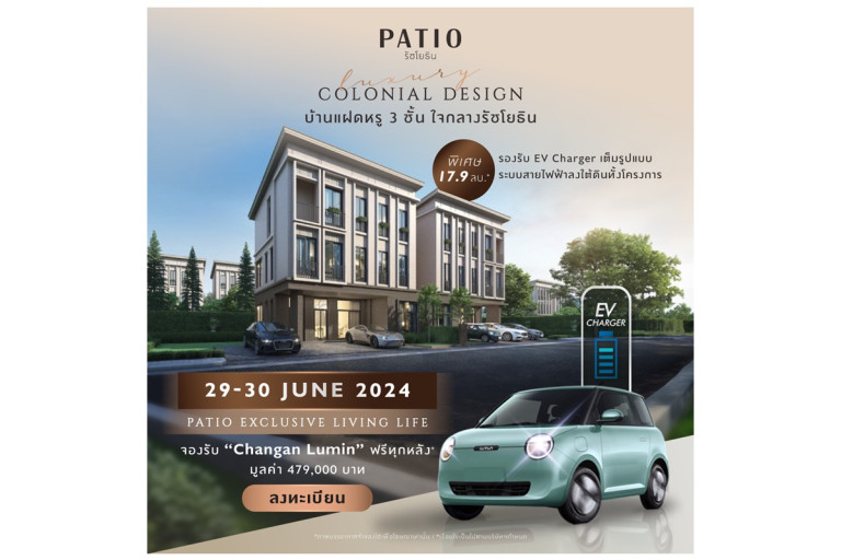 พิเศษ! จองบ้านในงาน “PATIO Exclusive Living Life X Changan Lumin” รับรถยนต์ไฟฟ้า Lumin L มูลค่า 479,000 บาท ฟรี! ทุกหลัง พร้อมเปิดประสบการณ์ ทดลองขับรถยนต์ไฟฟ้า Changan Lumin ถึงในโครงการ พร้อมรับข้อเสนอสุดพิเศษอีกมากมาย และสิทธิ์เลือกแปลงสวยใกล้คลับเฮ้าส์ก่อนใคร รวมไปถึงกิจกรรม Join Exclusive High Tea จาก Luxury Designer Brand