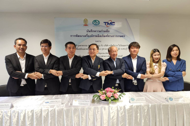 นายณัฏฐ์พงษ์ ปัญจวญาณ ประธานเจ้าหน้าที่บริหาร บริษัท ที.เอ็ม.ซี.อุตสาหกรรม จำกัด(มหาชน) กล่าวว่า "การลงนามบันทึกความร่วมมือในการพัฒนาเครื่องจักรผลิตภัณฑ์ทางการเกษตร ระหว่าง บริษัท ที.เอ็ม.ซี. อุตสาหกรรม จำกัด (มหาชน) กับ บริษัท ทรัพย์ถาวร ไบโอแมส จำกัด และ ศูนย์เชื้อเพลิงและพลังงานจากชีวมวล จุฬาลงกรณ์มหาวิทยาลัย จ.สระบุรี" ว่าปัจจุบันปัญหาเรื่องสิ่งแวดล้อมรุนแรงมากขึ้น ในฐานะที่ บริษัท ที.เอ็ม.ชี.อุตสาหกรรม จำกัด (มหาชน) มีความชำนาญในเรื่องของเทคโนโลยีการผลิตเครื่องจักรระบบไฮดรอลิก สำหรับกลุ่มอุตสาหกรรมรถยนต์ จึงถือโอกาสใช้ความชำนาญในอุตสาหกรรม มาพัฒนาเครื่องจักรที่มีอยู่ในปัจจุบัน มาช่วยในการลดปัญหาสิ่งแวดล้อมของประเทศ โดยเฉพาะการเผาวัสดุเหลือทิ้งทางการเกษตร ไม่ว่าจะเป็น ใบอ้อย ต้นข้าวโพดทางปาล์ม ฯลฯ โดยได้เข้าไปทำการศึกษาว่ามีงานวิจัยทางวิชาการเกี่ยวกับการผลิตเครื่องจักรกลการเกษตร ที่สามารถแปรูปวัสดุเหลือทิ้งทางการเกษตรให้มีมูลค่าเพิ่มด้วยนวัตกรรมชั้นสูง และพบว่าศูนย์เชื้อเพลิงและพลังงานจากชีวมวล จุฬาลงกรณ์มหาวิทยาลัย จ.สระบุรี ทำเรื่องนี้มาหลายปีแล้วมีการตั้งศูนย์สระบุรีขึ้นมา เพื่อการวิจัยด้านการเกษตรเพื่อผลิตเป็นเชื้อเพลิงรูปแบบต่างๆ บริษัท ที.เอ็ม.ซี.จึงเข้าไปขอใช้บริการทางวิชาการ โดยให้จุฬาฯช่วยถ่ายทอดงานวิจัย เพื่อผลิตเป็นเครื่องจักรกลการเกษตรแบบต่างๆ พร้อมกันนี้ ผู้อำนวยการศูนย์เชื้อเพลิงและพลังงานจากชีวมวล จุฬาลงกรณ์มหาวิทยาลัย จ.สระบุรี ได้แนะนำให้รู้จักกับผู้บริหาร บริษัท ทรัพย์ถาวร ไบโอแมส จำกัด ซึ่งมีความต้องการเครื่องจักรกลการเกษตรที่ผลิตโดยคนไทย มีนวัตกรรมที่เป็นมิตรกับสิ่งแวดล้อม เนื่องจากบริษัท ทรัพย์ถาวร ไบโอแมสจำกัด มีพื้นที่ปลูกอ้อยในจังหวัดเพชรบูรณ์จำนวนมาก พร้อมทั้งส่งเสริมชาวไร่ให้ร่วมปลูก โดยทางบริษัทฯก็ทำงานวิจัยร่วมกับจุฬฯในการแปรรูปใบอ้อยเป็นผลิตภัณฑ์ใบอ้อยอัดเม็ด-อัดก้อน จึงเป็นจุดเริ่มต้นให้ทั้งสองบริษัทมีความร่วมมือกัน