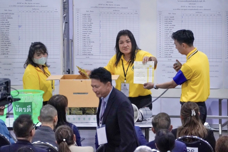 โดยบริเวณจอมอนิเตอร์ที่ กกต. ถ่ายทอดสดการลงคะแนนจากภายในห้อง พบว่า มีผู้สังเกตการณ์ซึ่งลงทะเบียนล่วงหน้าจำนวนมากมาติดตามการนับคะแนนอย่างใจจดใจจ่อ ขณะที่นายแสวง บุญมี เลขาธิการ กกต. ในฐานะผู้อำนวยการการเลือกตั้ง เตรียมแถลงหลังนับคะแนนรอบแรกเสร็จสิ้น ก่อนจับสลากแบ่งสายต่อไป