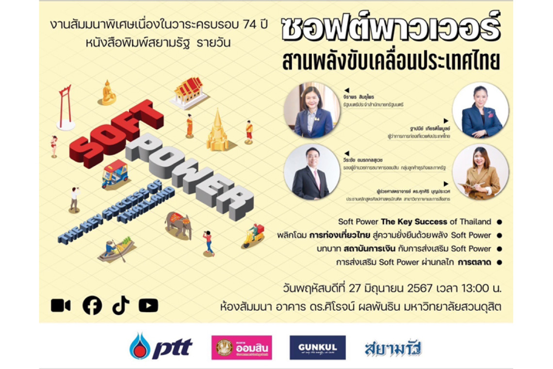 เมื่อวันที่ 27 มิ.ย.2567 ณ ห้องสัมมนา อาคาร ดร.ศิโรจน์ ผลพันธิน มหาวิทยาลัยสวนดุสิต สยามรัฐ จัดงานสัมมนาพิเศษ ในหัวข้อ “Soft Power The Key Success of Thailand” (ซอฟต์พาวเวอร์ สานพลังขับเคลื่อนประเทศไทย)