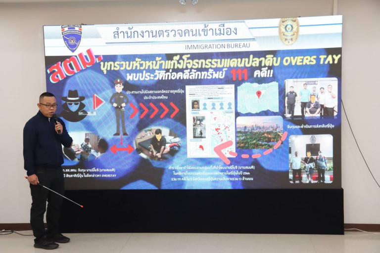 วันที่ 27 มิ.ย.67 ที่ สตม.ภายใต้การอำนวยการของ พล.ต.ท.อิทธิพล อิทธิสารรณชัย ผบช.สตม., พล.ต.ต.พันธนะ นุชนารถ รอง ผบช.สตม., พล.ต.ต.ประพันธ์ศักดิ์ ประสานสุข ผบก.สส.สตม., พ.ต.อ.รัฐโชติ โชติคุณ รอง ผบก.สส.สตม., พ.ต.อ.ภาณุภาคยณ์ จิตต์ประยูรตี รอง ผบก.สส.สตม., พ.ต.อ.ชิตเดชา สองห้อง รอง ผบก.สส.ภ.7 ปฏิบัติราชการ บก.สส.สตม., พ.ต.อ.ธวัชชัย นรินรัตน์ ผกก.1 บก.สส.สตม., พ.ต.อ.รัฐพงศ์ แก้วยอด ผกก.4 บก.สส.สตม. แถลงข่าวจับกุมหัวหน้าแก๊งโจรกรรมแดนปลาดิบ OVERSTAY พบประวัติก่อคดีลักทรัพย์ 111 คดี