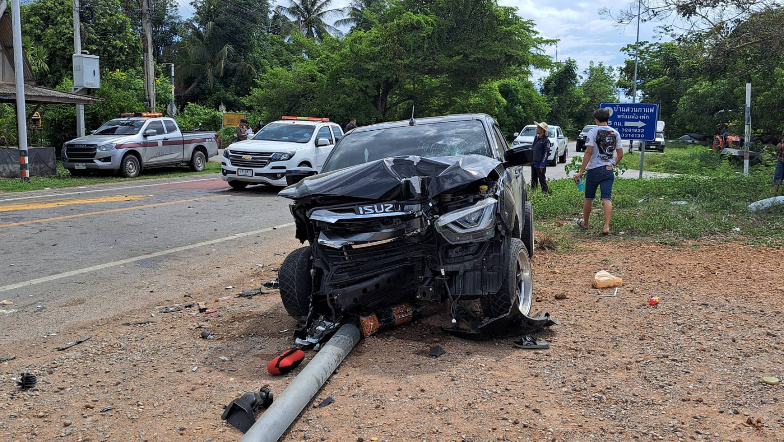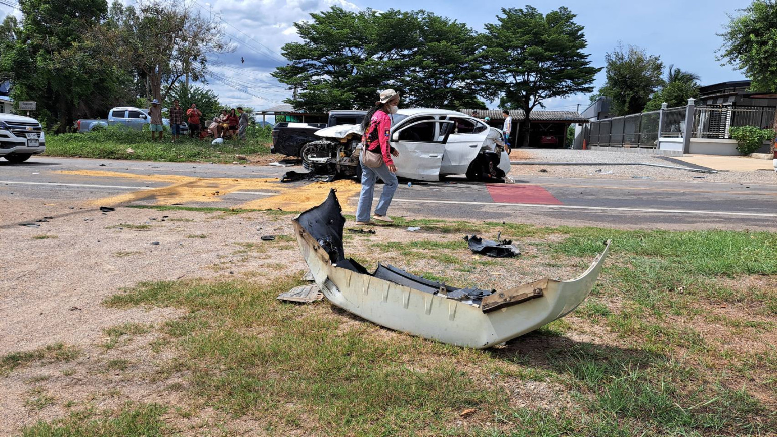 ในที่เกิดเหตุพบรถยนต์เก๋งมิสซูสีขาว ทะเบียน ขธ-xxxx นครราชสีมา สภาพพังยับเยิน ทราบว่าในรถคันดังกล่าวมีคนที่นั่งมาด้วย4คน1ใน4เสียชีวิต ใกล้กันพบรถยนต์กระบะอีซูซุ4ประตูสีดำ ทะเบียน กร-xxxx ราชบุรี สภาพพังยับ รถได้เสียหลักชนเสาไฟส่องทางหักติดใต้ท้องรถ ซึ่งคนกระบะมีผู้โดยสารมาทั้งหมด5คน เจ็บเล็กน้อยไม่ประสงค์ไปโรงพยาบาล 3 ราย อีก2รายนำส่งโรงพยาบาล ร่วมผู้บาดเจ็บ6รายแบ่งเป็นชาย1รายด.ช.1ราย หญิง 4 รายแต่หญิงเสียชีวิต1ราย