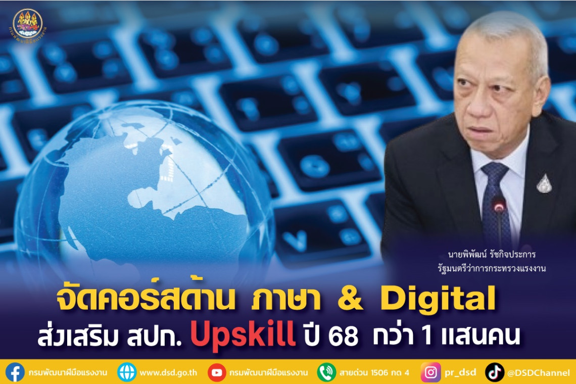นายพิพัฒน์ รัชกิจประการ รัฐมนตรีว่าการกระทรวงแรงงาน เปิดเผยว่า การพัฒนาทักษะแรงงานด้านซอฟท์สกิล ภาษาอังกฤษและดิจิทัลให้สอดคล้องกับนโยบายการพัฒนากำลังคนของประเทศนั้น กระทรวงแรงงาน โดยกรมพัฒนาฝีมือแรงงานได้ดำเนินการขับเคลื่อนภารกิจอย่างเข้มข้นเสมอมา โดยเฉพาะแรงงานในสถานประกอบกิจการ หากได้รับการพัฒนาทักษะในด้านดังกล่าวจะสามารถยกระดับฝีมือให้เป็นแรงงานคุณภาพ ช่วยลดต้นทุนการผลิต และสามารถปรับตัวทำงานร่วมกับ AI ได้ โดยไม่ถูกหุ่นยนต์มาแทนที่งาน และการมีทักษะด้านภาษาจะช่วยให้ฐานรากแรงงานมีความเข้มแข็งรองรับการเข้ามาลงทุนของชาวต่างชาติ หนุนการเติบโตของเศรษฐกิจไทยอย่างยั่งยืน ทั้งนี้ ได้กำชับและเน้นย้ำให้กรมเร่งดำเนินการและส่งเสริมสถานประกอบกิจการพัฒนาทักษะให้แก่แรงงานอย่างเร่งด่วน ซึ่งตั้งเป้าหมายการพัฒนาทักษะแรงงานปี 2568 เน้นทักษะด้านภาษาและดิจิทัล กว่า 100,000 คนทั่วประเทศ